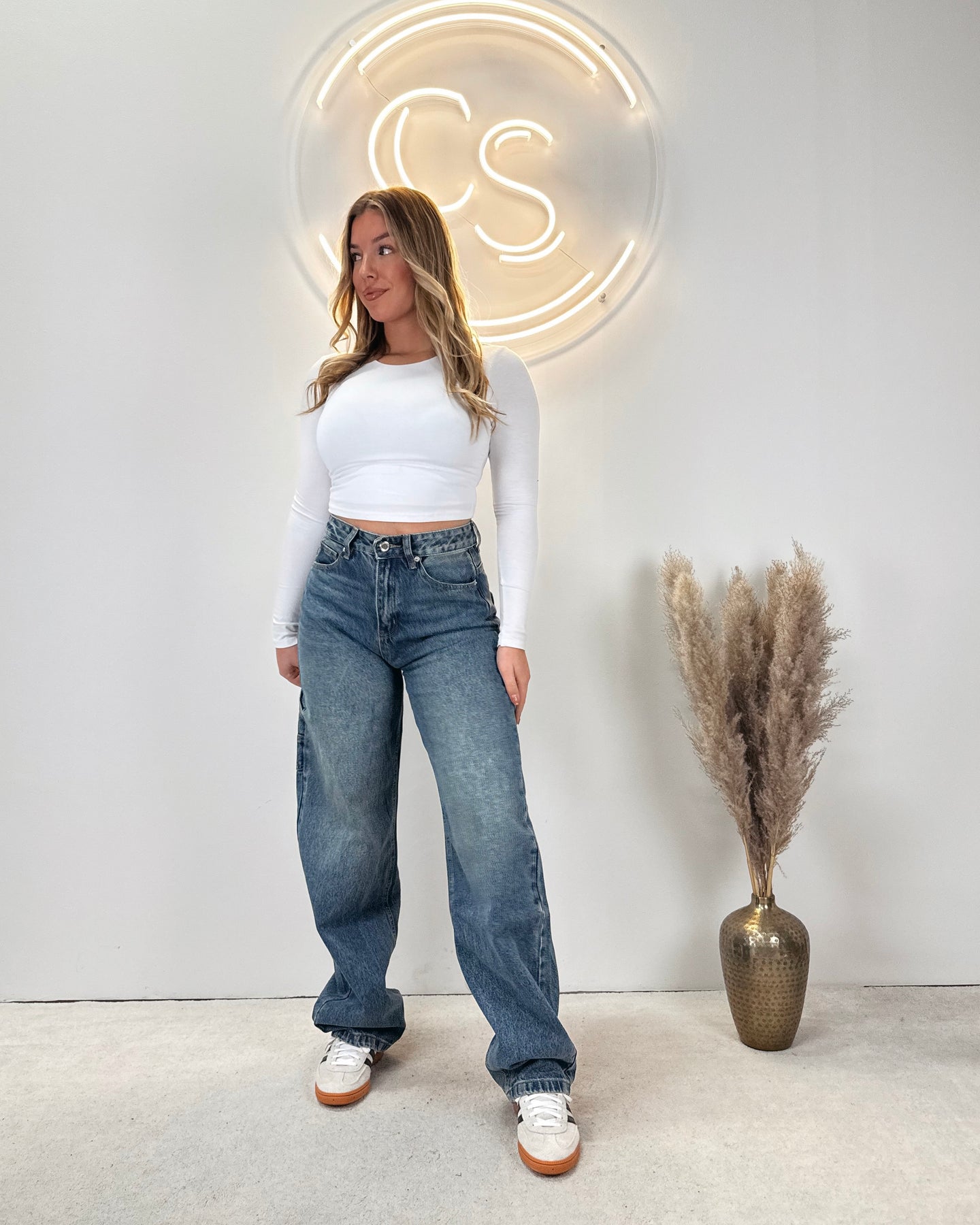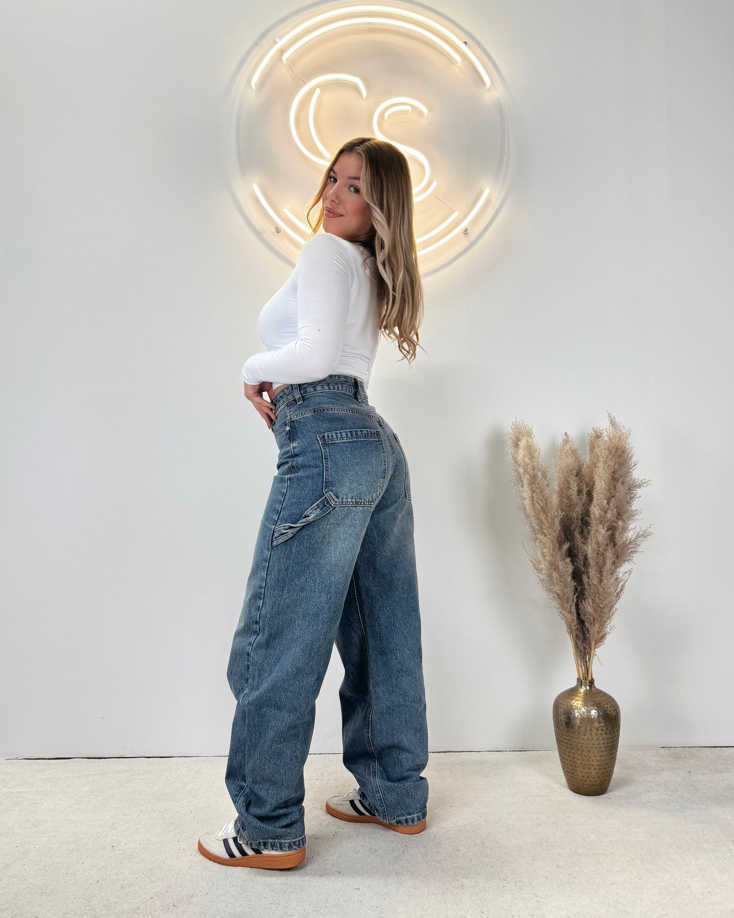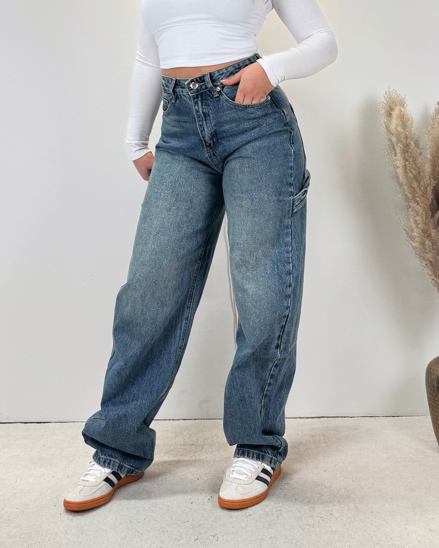 Onze Baggy Strap Jeans Dark Blue is een echte musthave jeans. Deze jeans heeft een baggy fit en valt high waisted. De jeans heeft een strap aan de zijkant. De jeans bevat geen stretch, maar valt goed op maat! We love it!