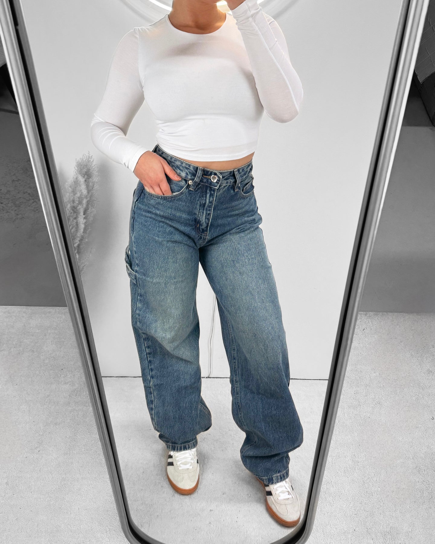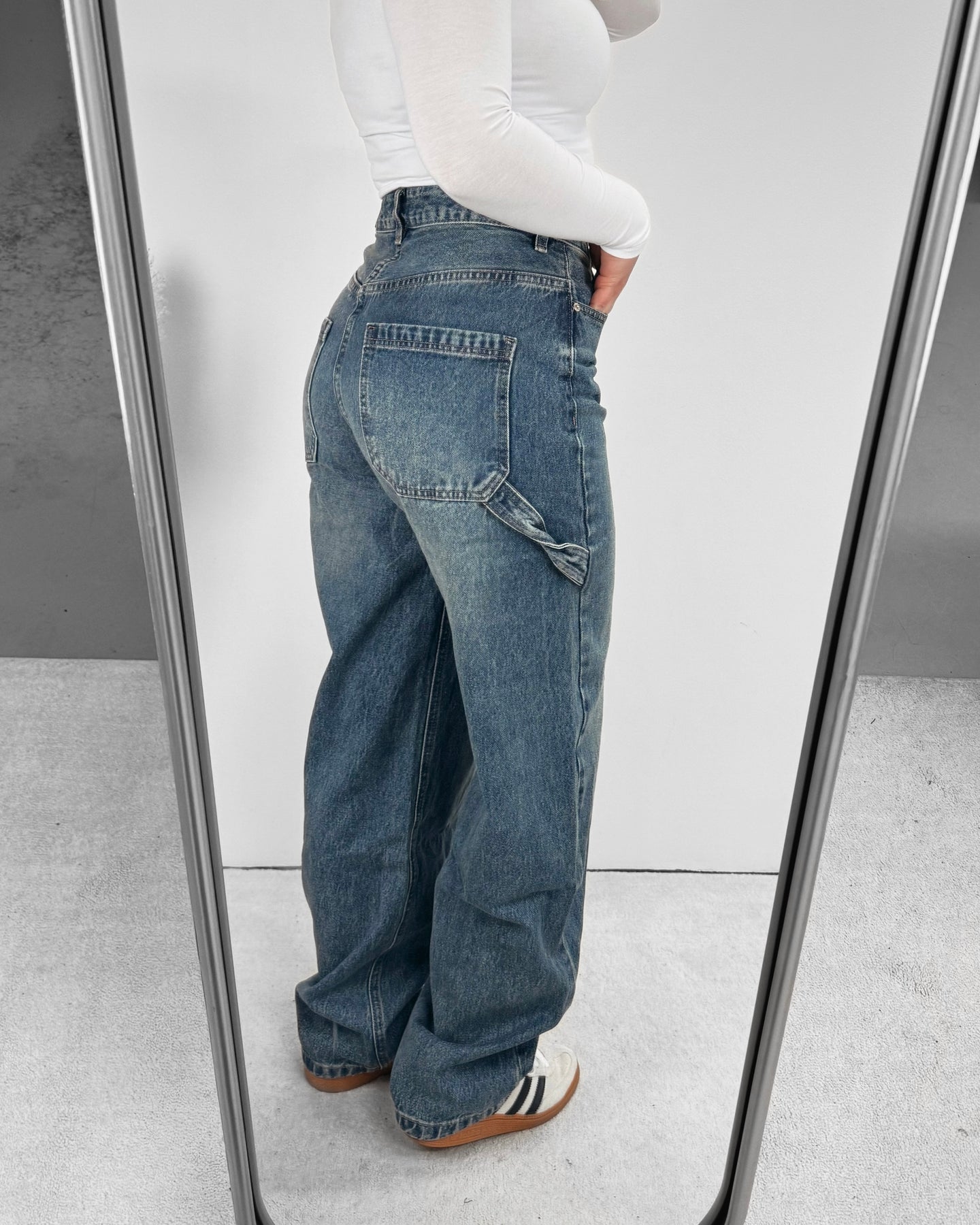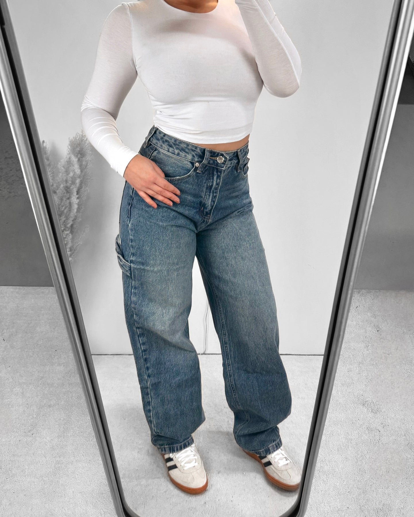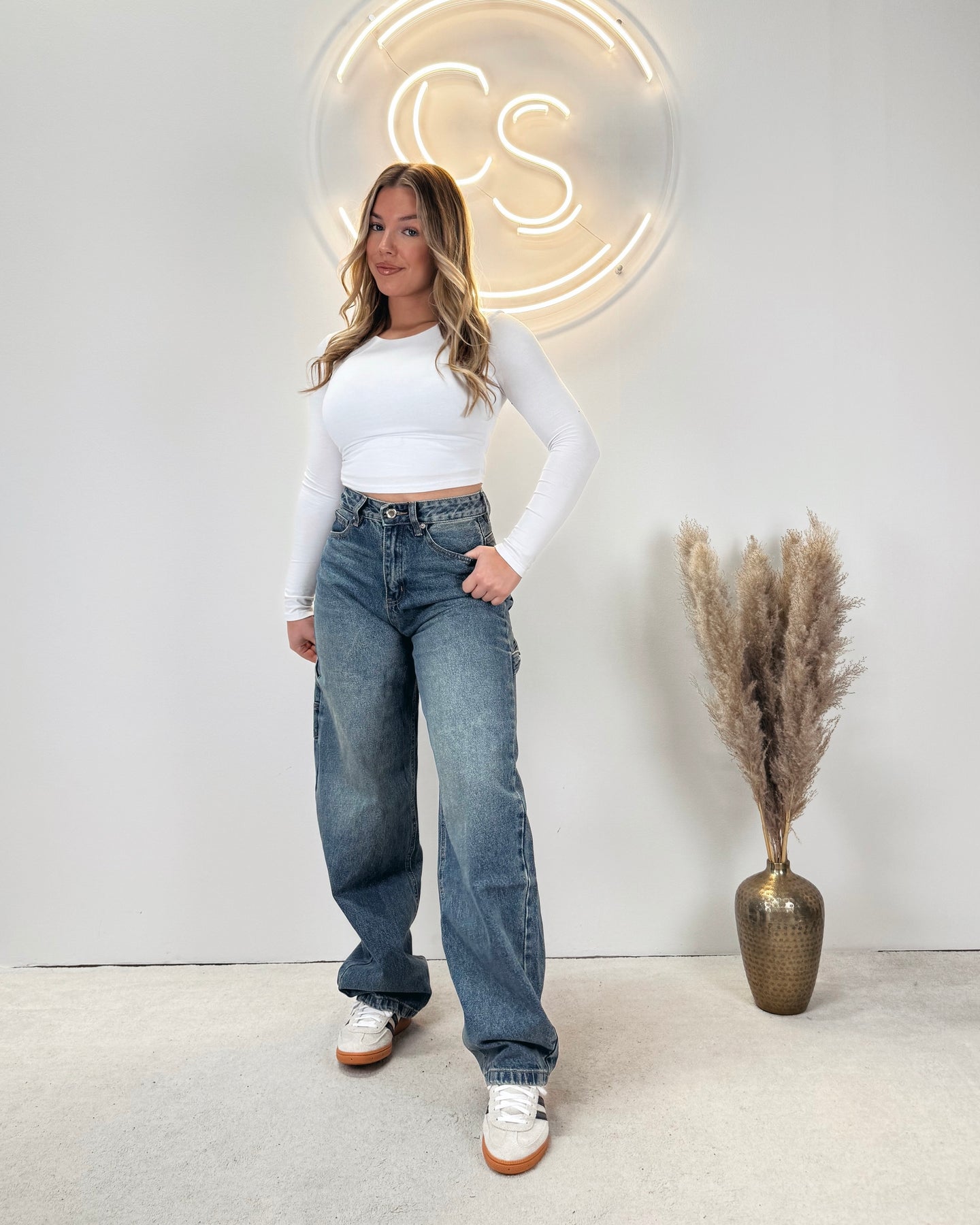 Onze Baggy Strap Jeans Dark Blue is een echte musthave jeans. Deze jeans heeft een baggy fit en valt high waisted. De jeans heeft een strap aan de zijkant. De jeans bevat geen stretch, maar valt goed op maat! We love it!