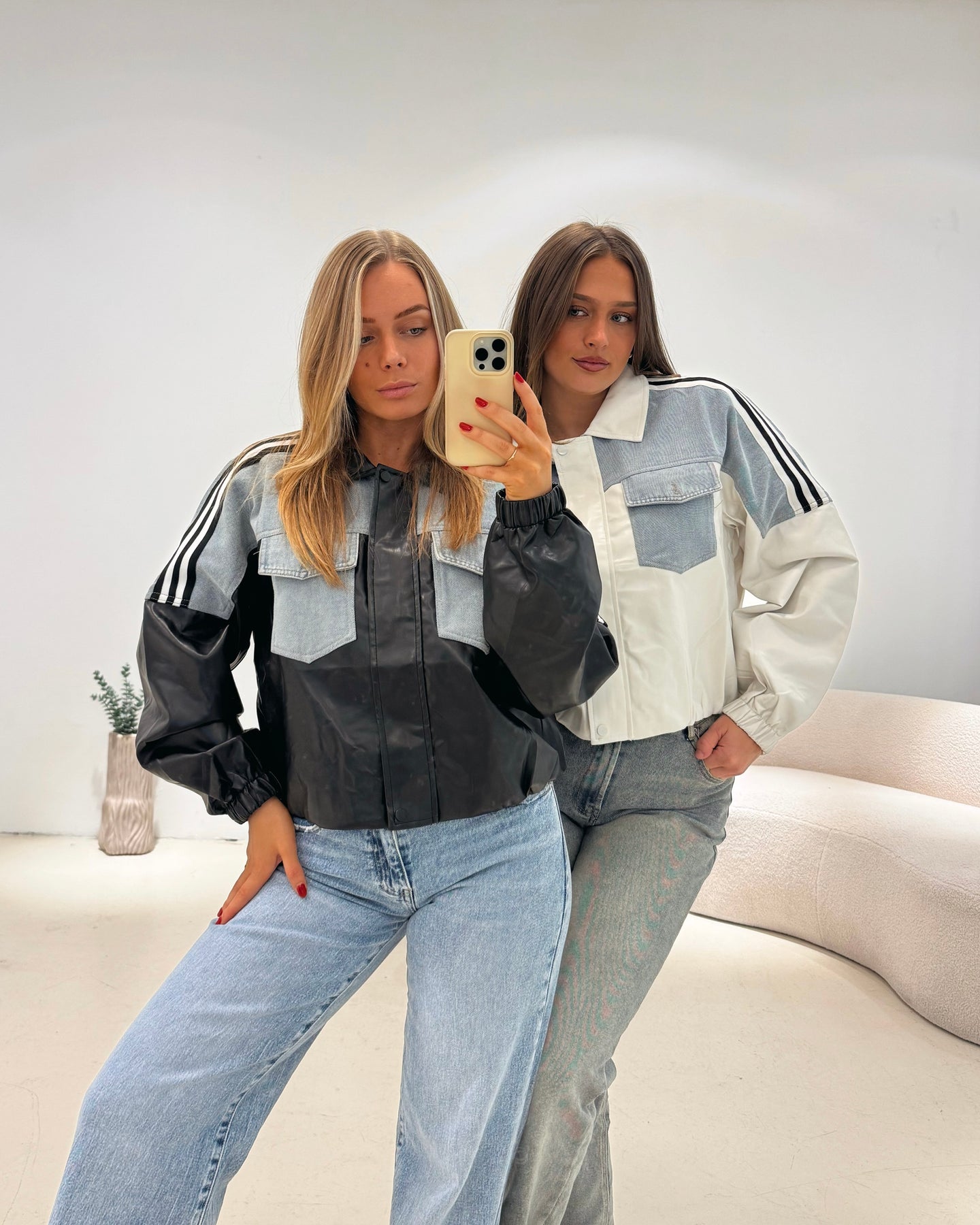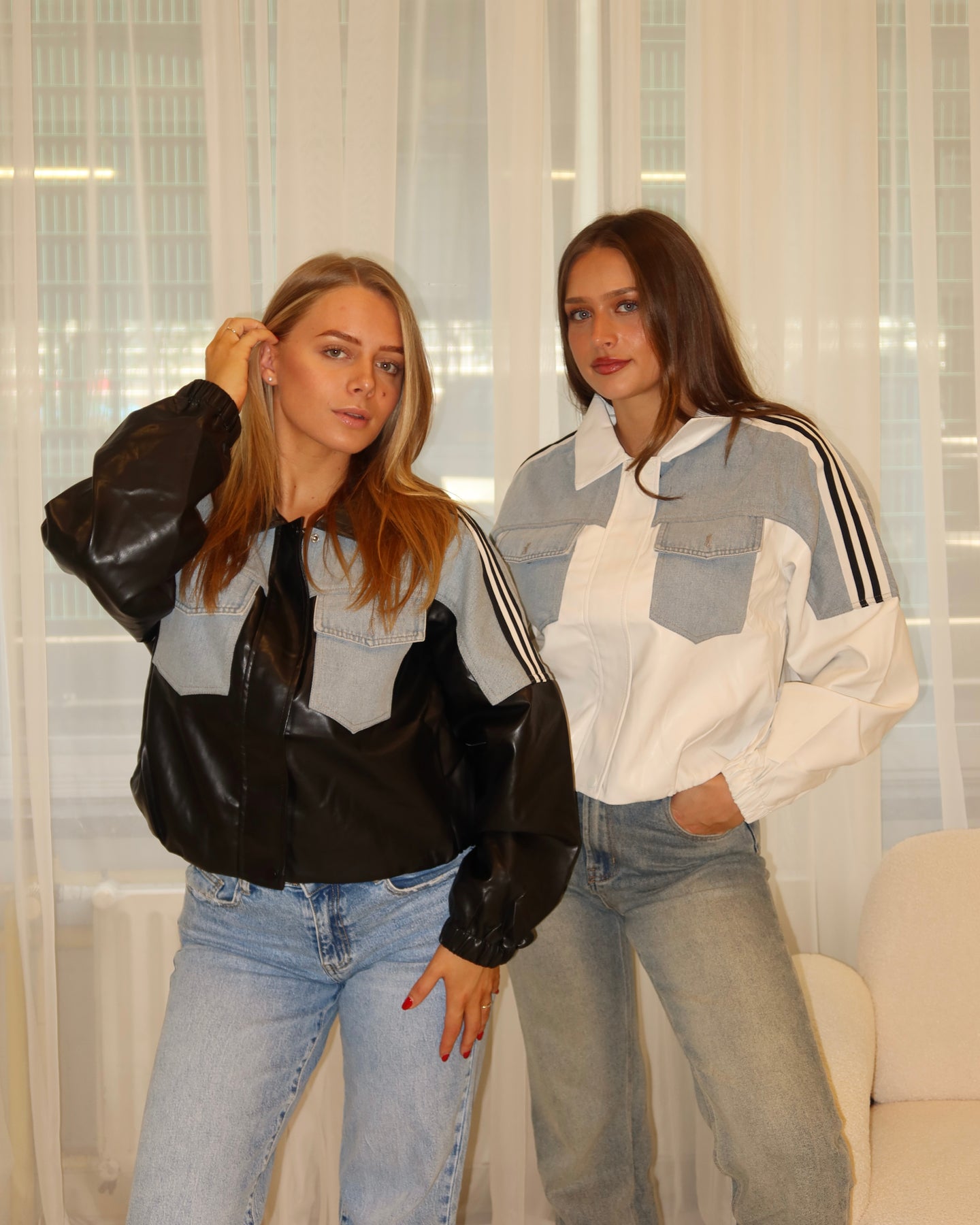 Onze Denim Striped Leather Jacket is een faux leer jasje met spijker details. Het jasje heeft witte strepen op de mouwen. Op de rug staat de tekst ‘PARIS’ en het jasje is te sluiten met een rits. Dit item is verkrijgbaar in het zwart en wit.