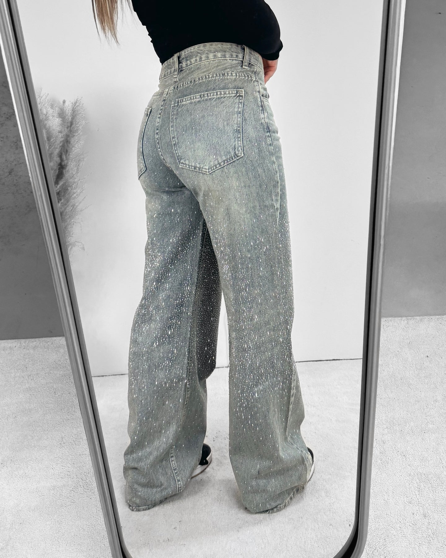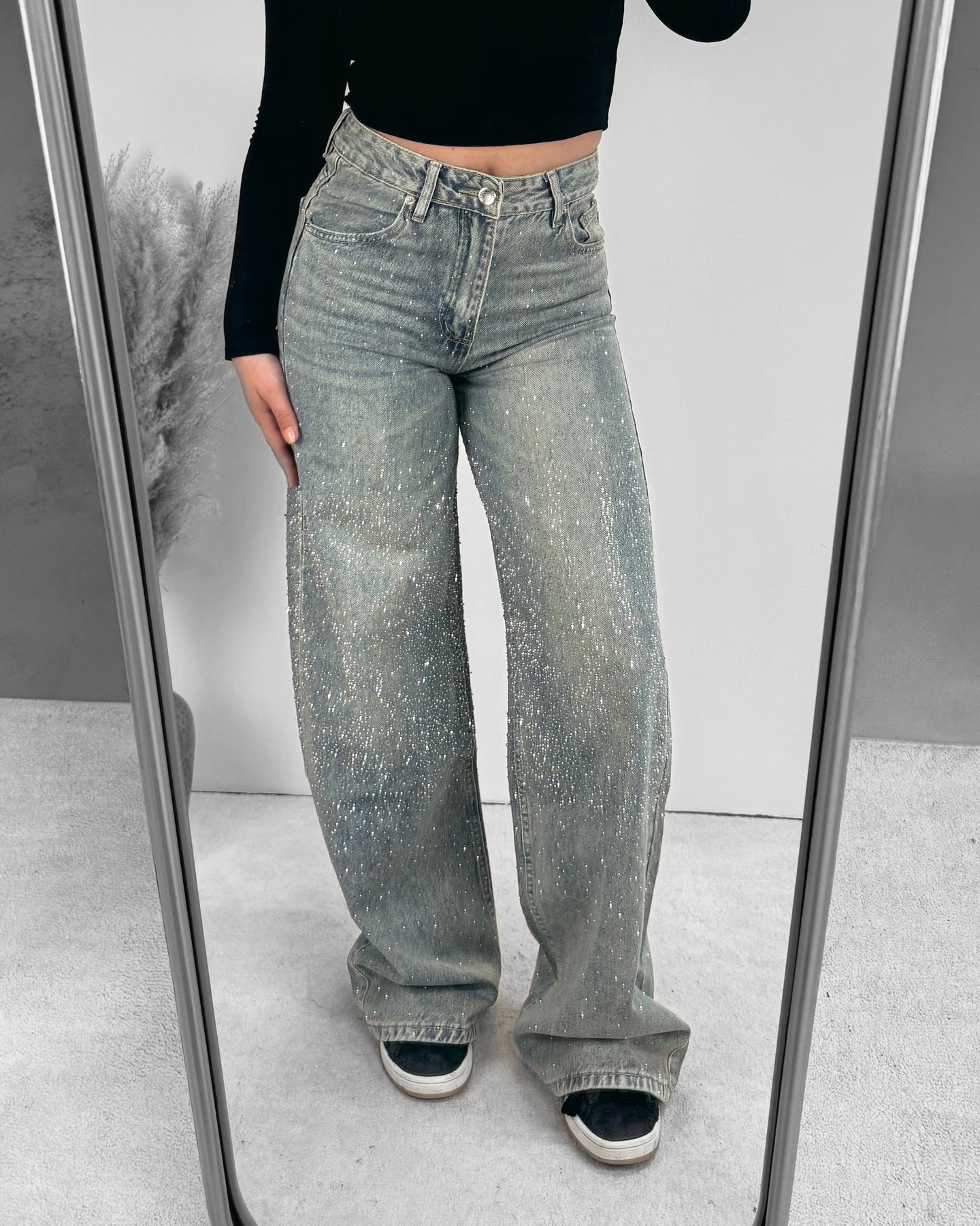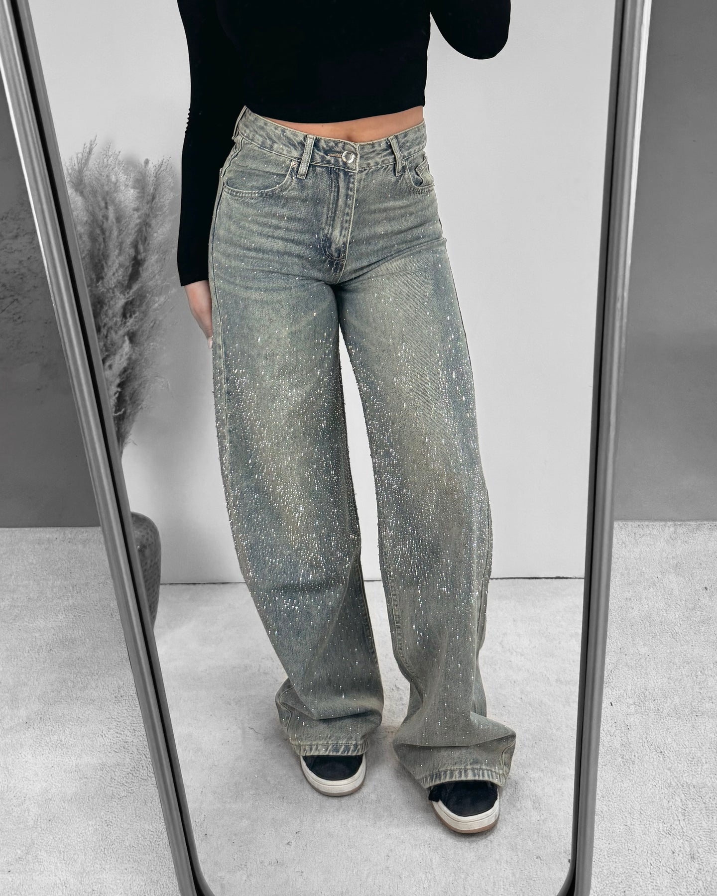 Onze Glitter Wide Leg Jeans Washed Blue is een prachtige jeans met veel glitter steentjes. De jeans heeft een gewassen blauwe kleur. De jeans heeft een wide leg fit en valt high waisted. De jeans bevat geen stretch, maar valt goed op maat!
