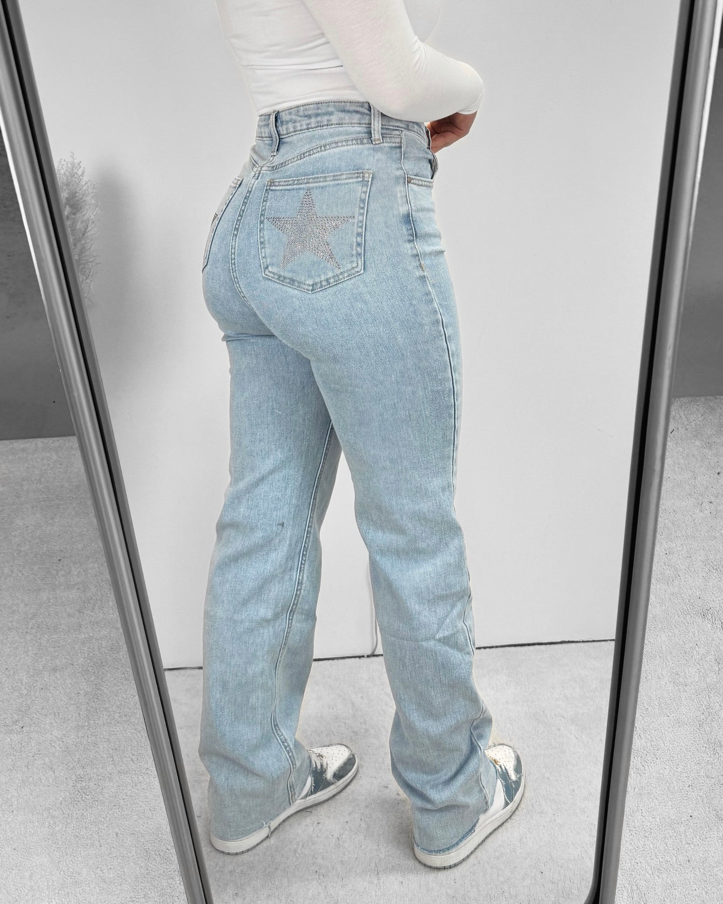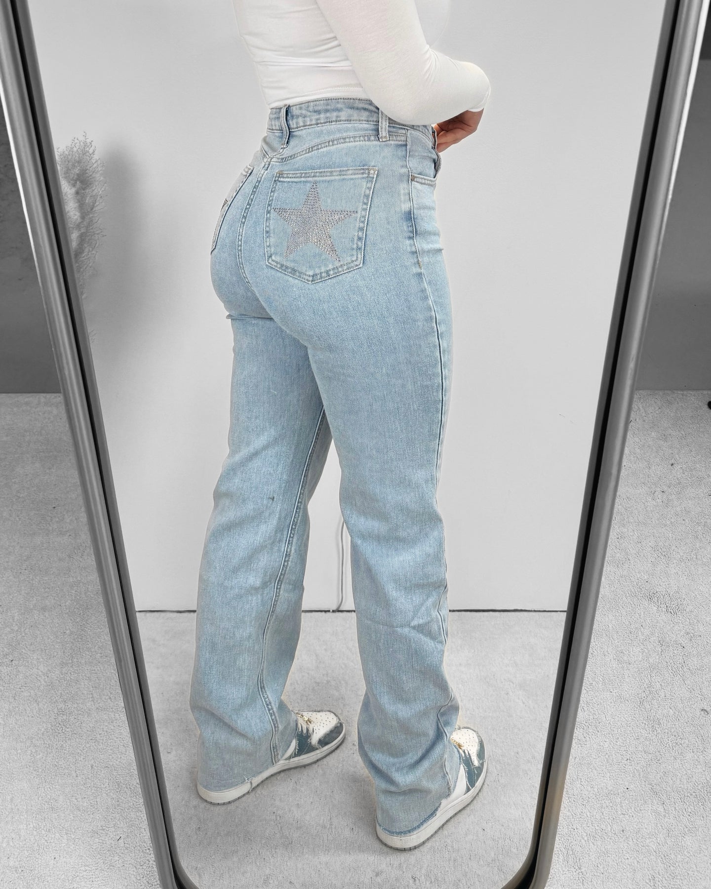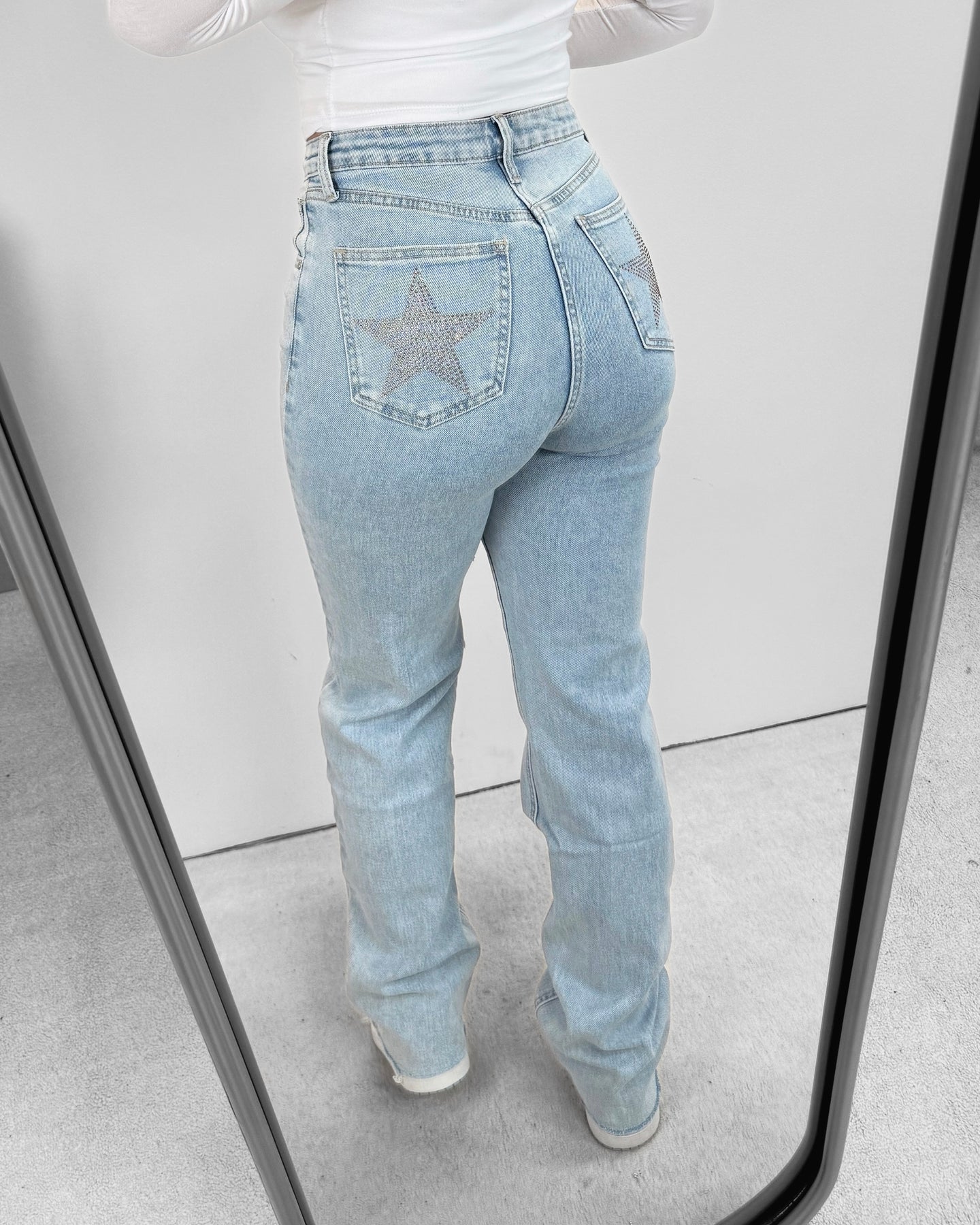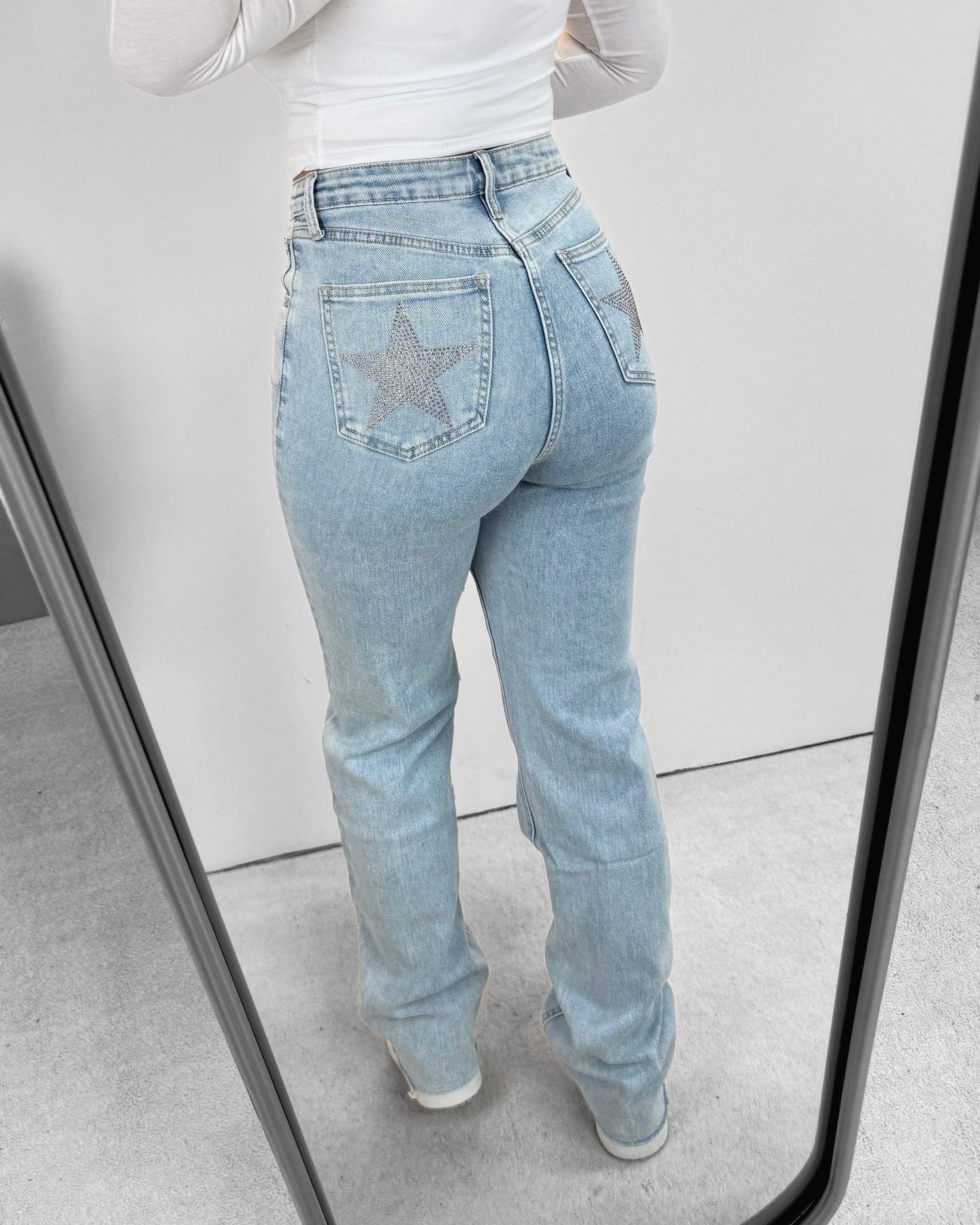 Onze Stars Pocket Stretch Straight Leg Jeans Blue zit echt als gegoten! Deze jeans valt high waisted en heeft veel stretch. De jeans heeft rhinestone steentjes in de vorm van een ster op beide achterzakken! Wij zijn verliefd op deze nieuwe stretch jeans!