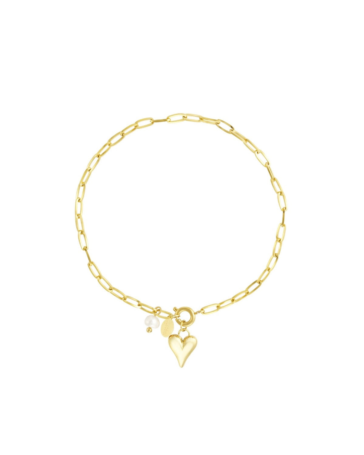 Onze Adore Charms Bracelet Gold is een roestvrijstalen armband met een schattig bedeltje (een hartje en parel). De armband is gemaakt van roestvrij staal en verkleurt dus niet! Deze armband is waterproof.