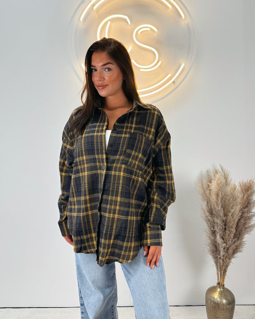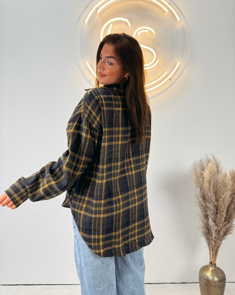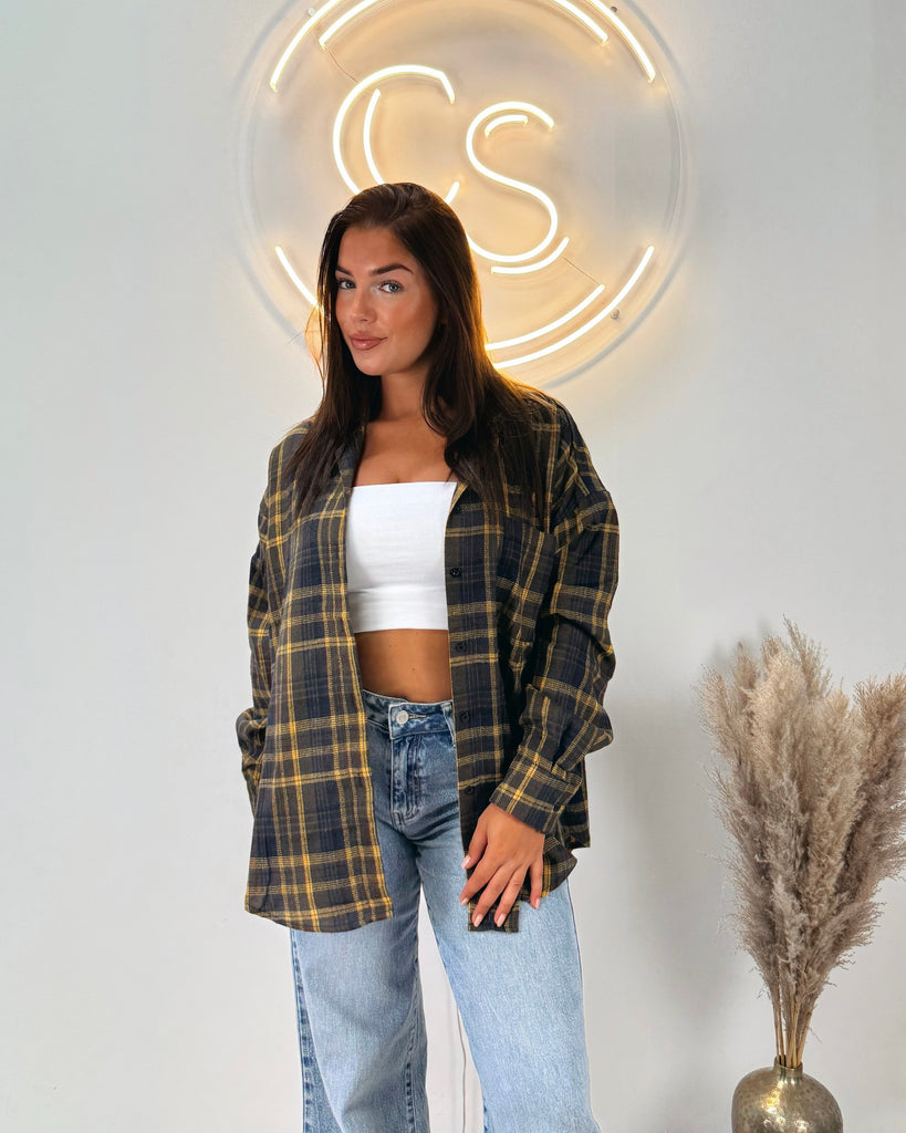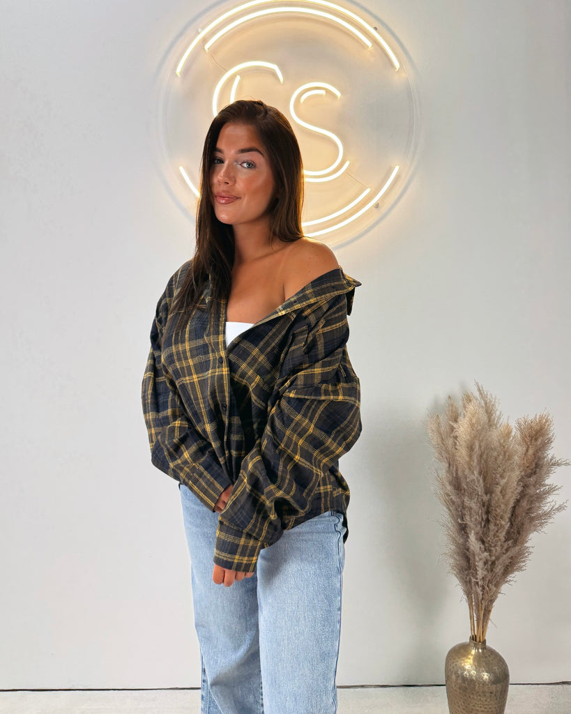 Onze Checks Blouse Yellow is een oversized blouse met een ruitjespatroon. De blouse heeft een gele kleur en valt oversized. Je kan de blouse leuk dicht dragen of open dragen met een crop top eronder!