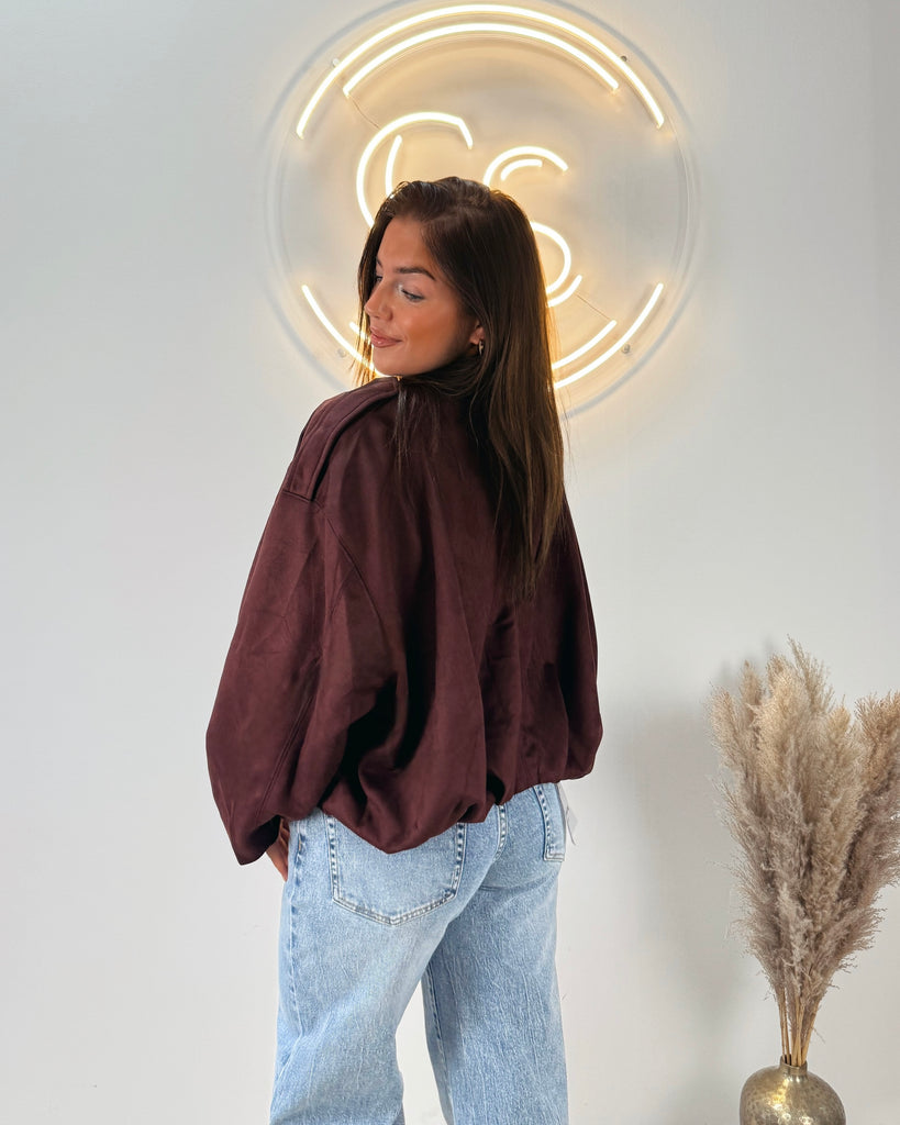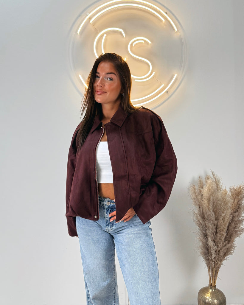 Viral jacket! Onze Suede Jacket is een jasje gemaakt van een zachte suede stof. Het jasje heeft een rits om te sluiten en valt oversized. Dit jasje is verkrijgbaar in bordeaux rood, bruin en khaki groen.
