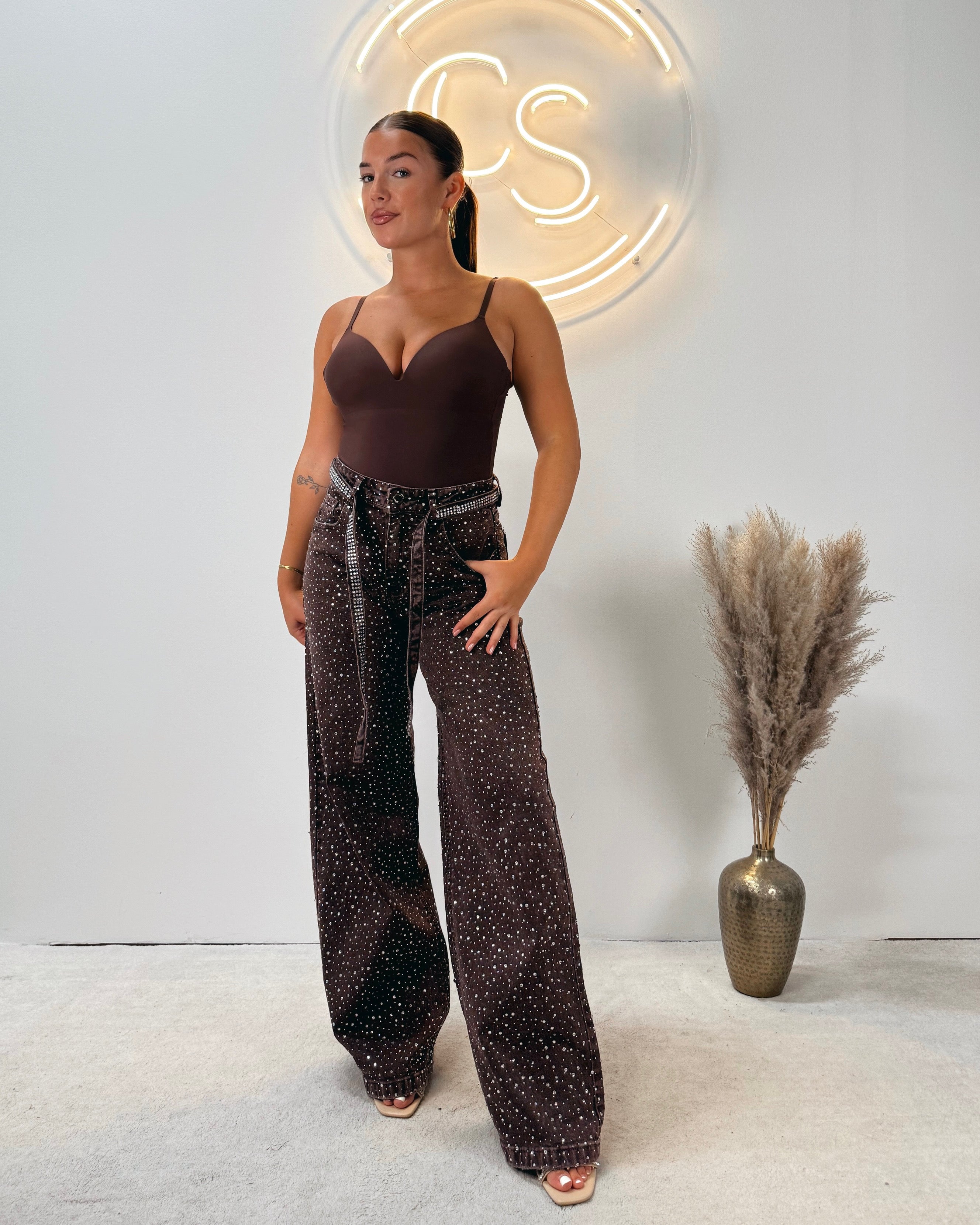 Onze Ultimate Glitter Wide Leg Jeans Brown is een jeans met een bruine kleur en met prachtige glitter steentjes. De jeans heeft een wide leg fit en valt mooi high waisted. De jeans heeft een bijbehorende riem met glitter steentjes. De jeans is tall proof en valt goed lang!