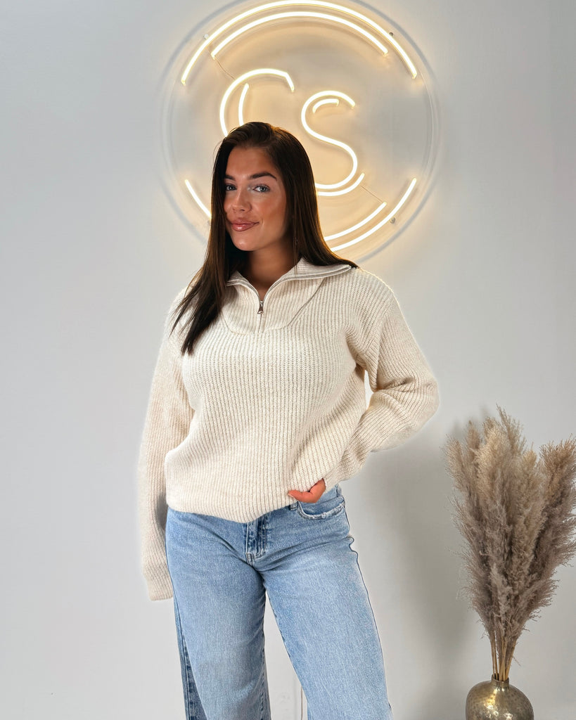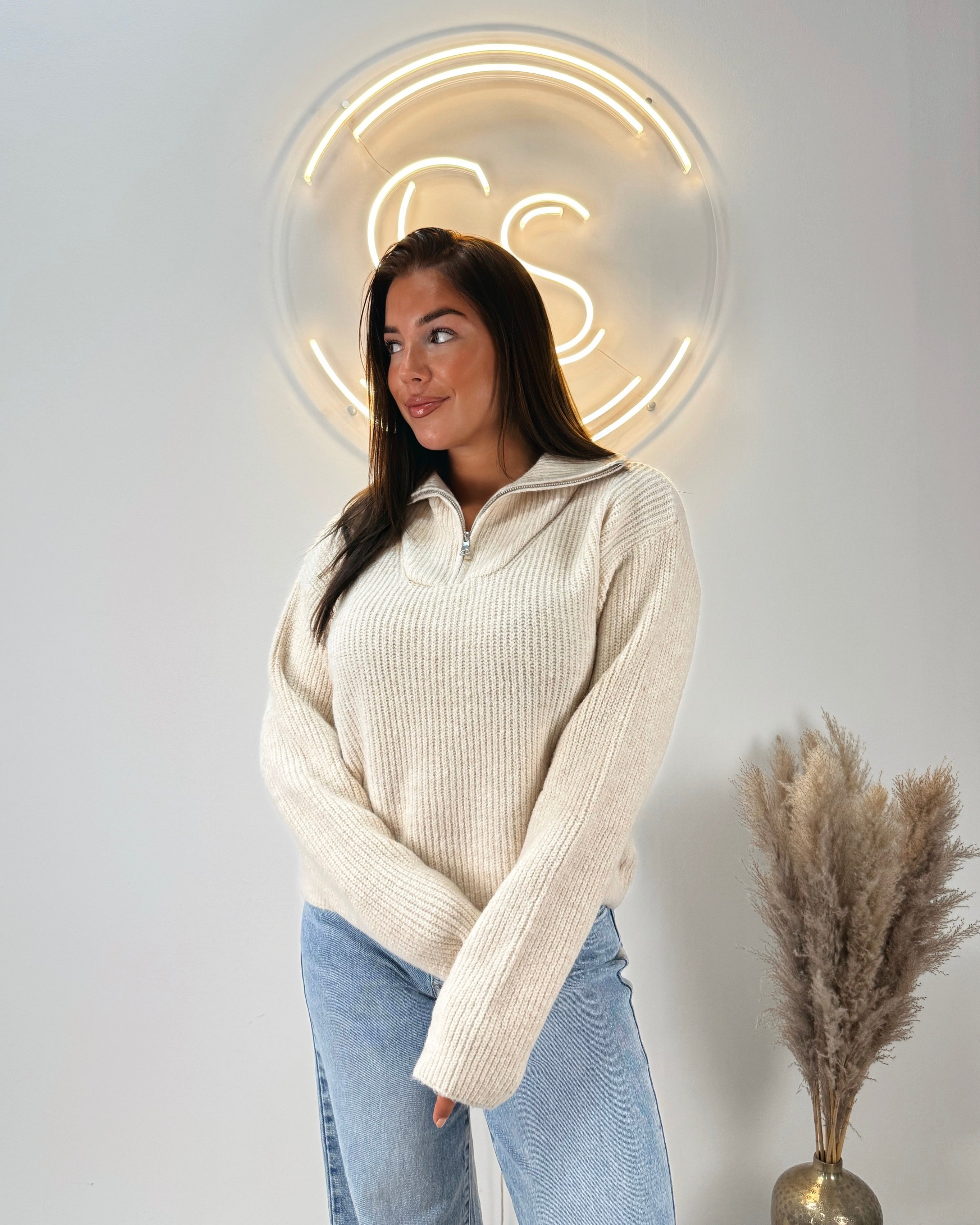 Onze Zipper Knit Sweater Beige is een comfy musthave! Deze trui is heerlijk zacht en heeft een kraagje met een rits. Deze rits kan je open of dicht dragen. De trui is gemakkelijk te combineren! Dit item is verkrijgbaar in beige en grijs.