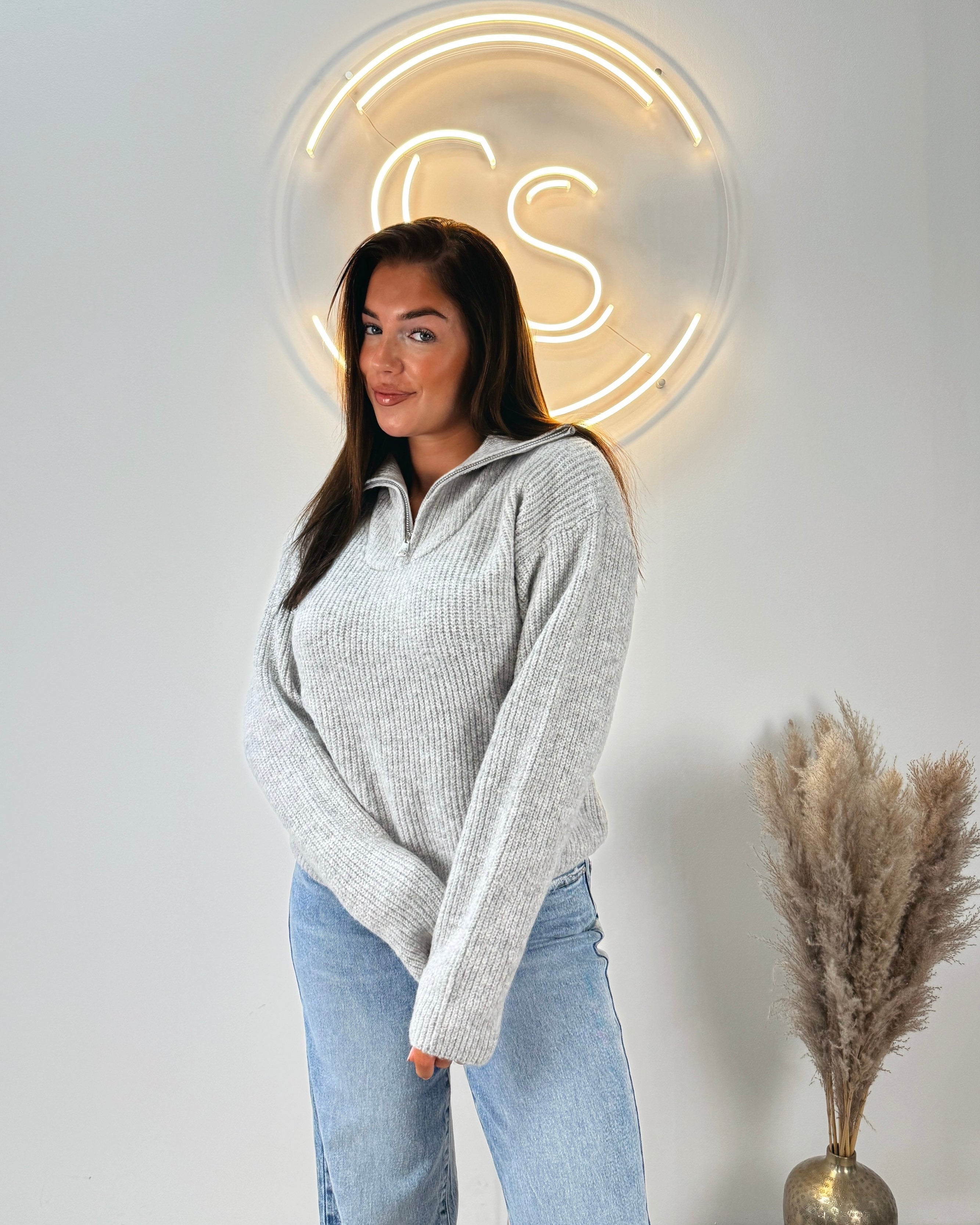 Onze Zipper Knit Sweater Grey is een comfy musthave! Deze trui is heerlijk zacht en heeft een kraagje met een rits. Deze rits kan je open of dicht dragen. De trui is gemakkelijk te combineren! Dit item is verkrijgbaar in beige en grijs.