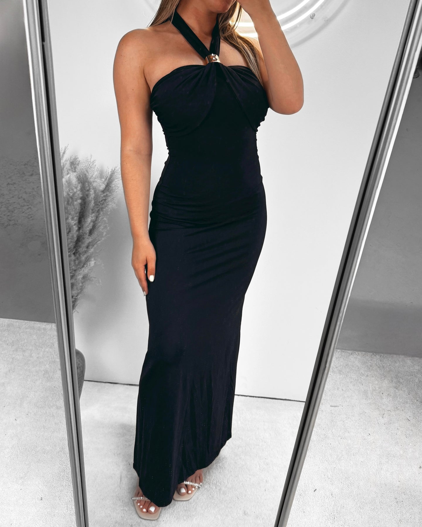 Onze Halter Maxi Dress Black is een prachtige maxi lange jurk! De jurk is zwart van kleur en bevat veel stretch. De jurk heeft een mooi gouden detail bij de nek (deze is verschuifbaar). Deze jurk is perfect voor een classy dinner!