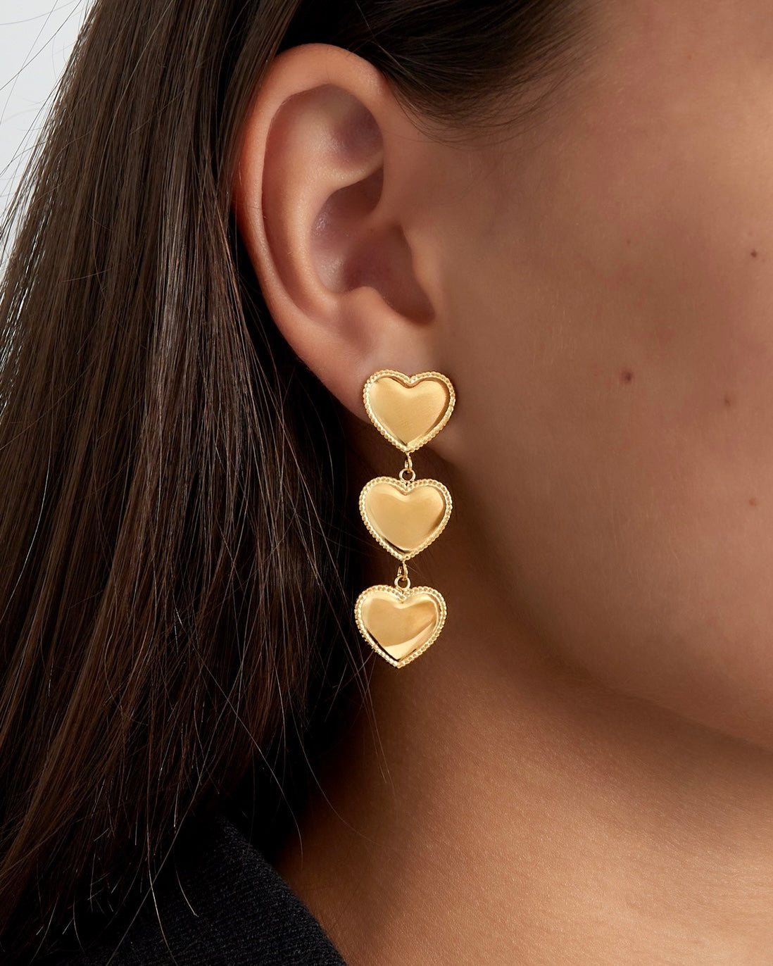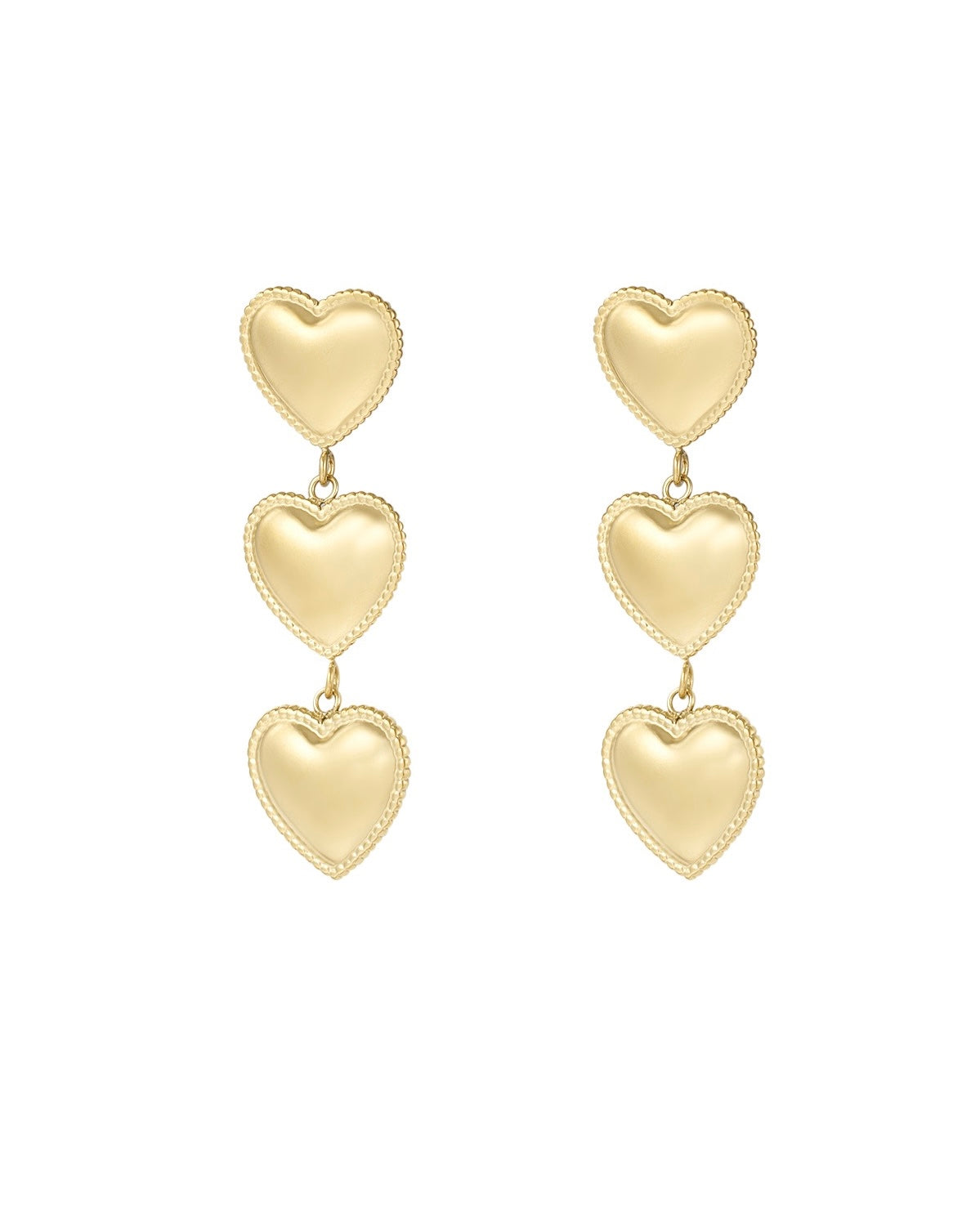 Onze Trendy Heart Earrings Gold zijn gouden oorbellen met drie hartjes. Mega trendy en super leuk om te combineren met onze andere sieraden! De oorbellen zijn gemaakt van roestvrij staal en verkleuren dus niet! Deze oorbellen zijn 100% waterproof.