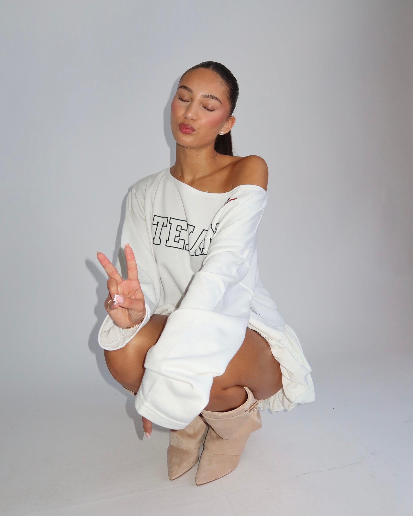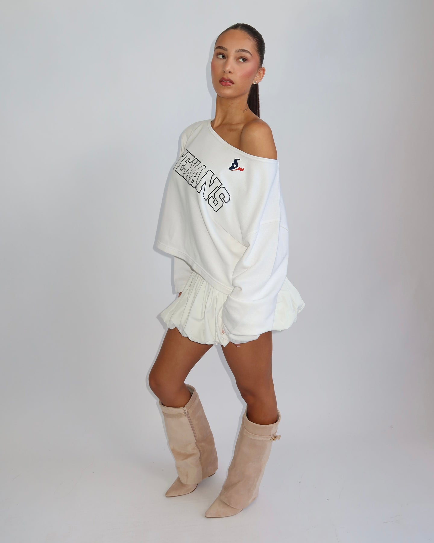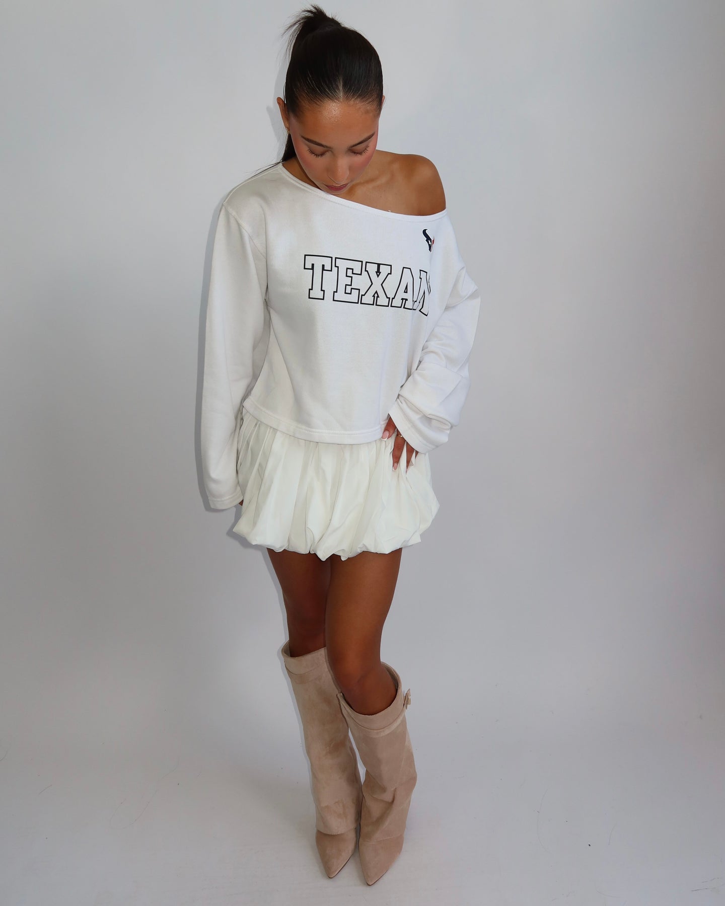 Regular price €34,95Onze Texans Off-Shoulder Top is een zachte off-shoulder top. De top heeft de opdruk ‘texans’. Dit item is verkrijgbaar in zwart en wit.