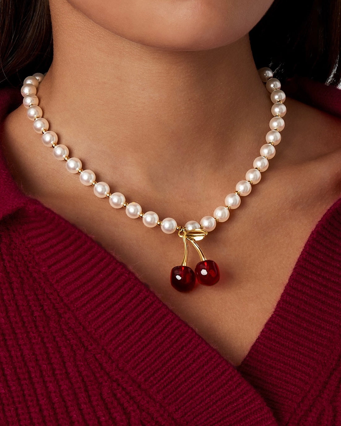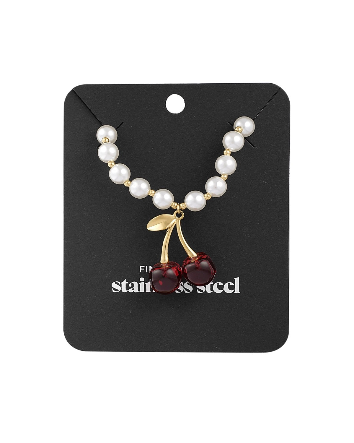 Onze Cherry Pearl Necklace Gold is een statement ketting met parels en een kers als bedel. De ketting is gemaakt van roestvrij staal en verkleurt dus niet. Dit item is een echte statement ketting!