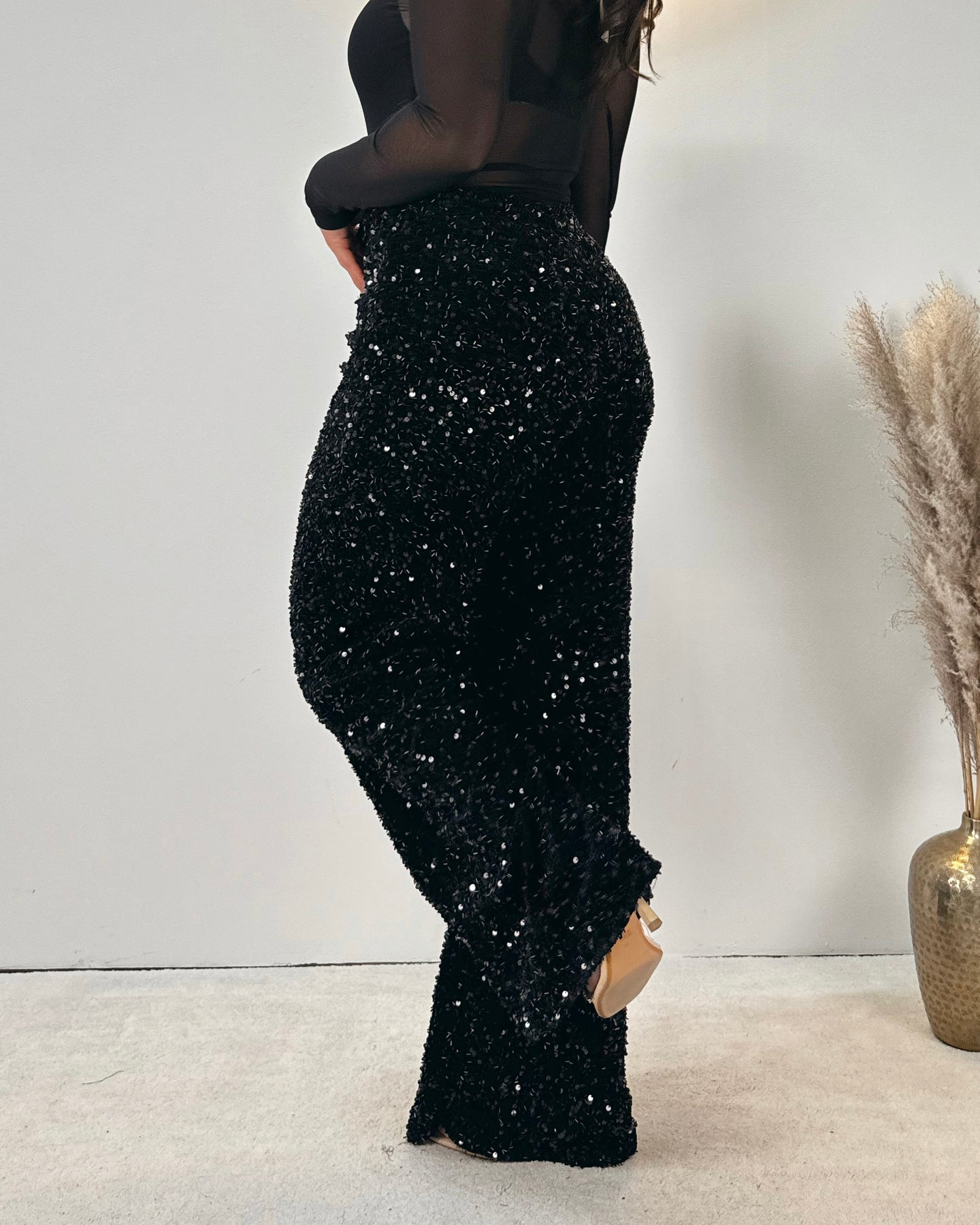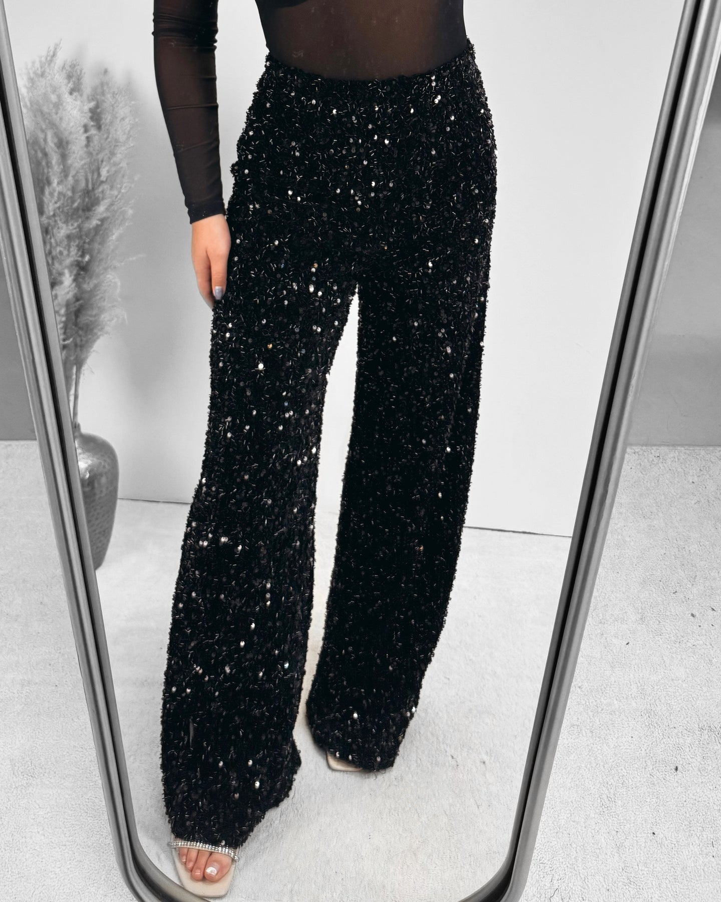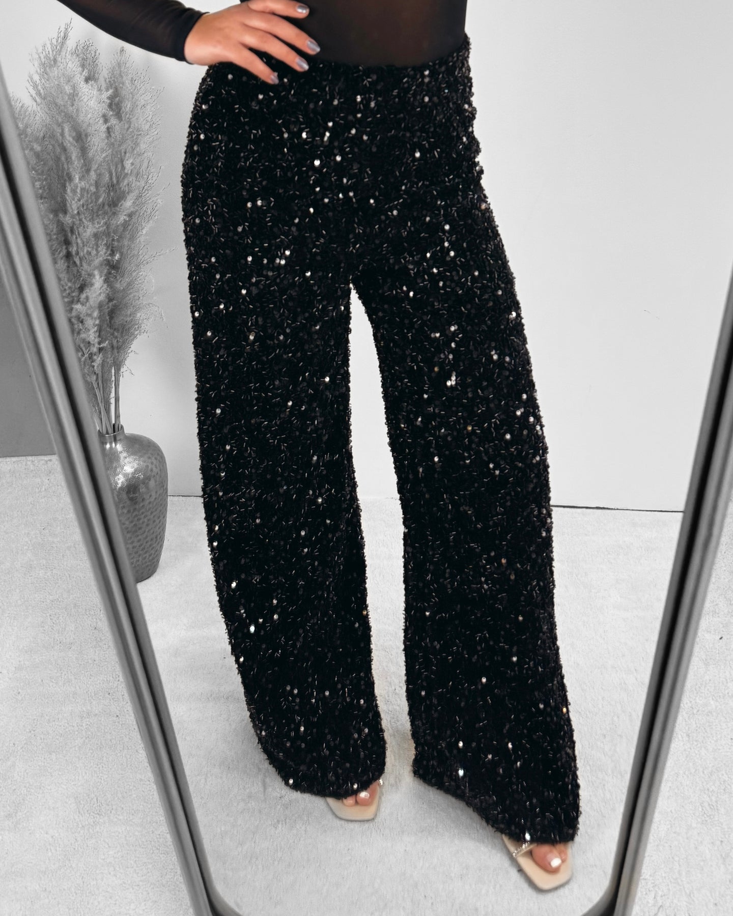 Regular price €44,95Onze Sequins Wide Leg Pants is een prachtige broek met glitter pailletten. De broek valt high waisted en heeft een wide loose fit. Dit item bevat stretch en heeft een binnenvoering; hierdoor kriebelt de broek niet. Met deze broek ben jij absoluut ready voor de feestdagen!