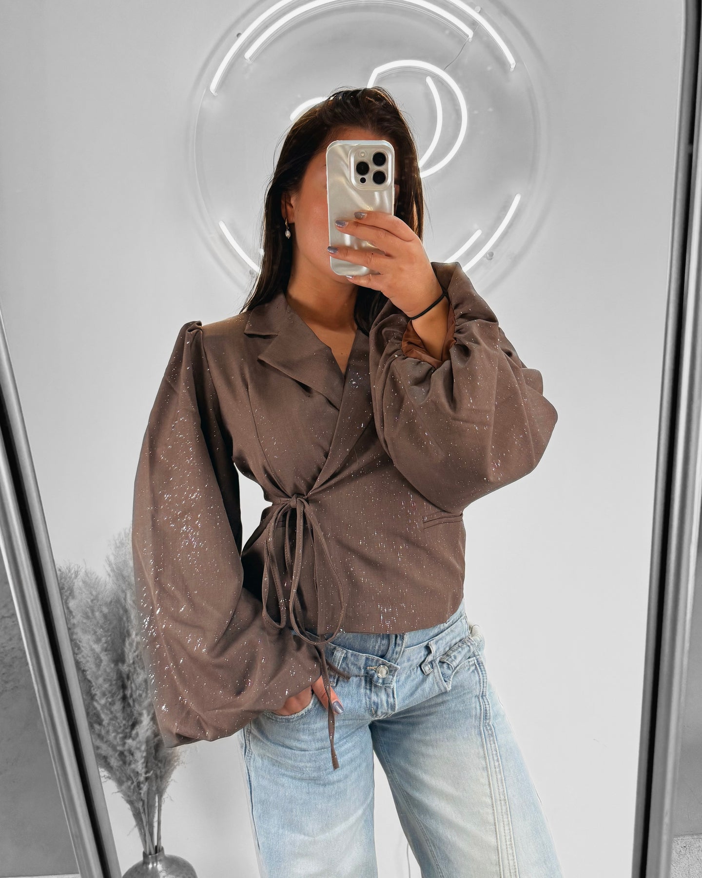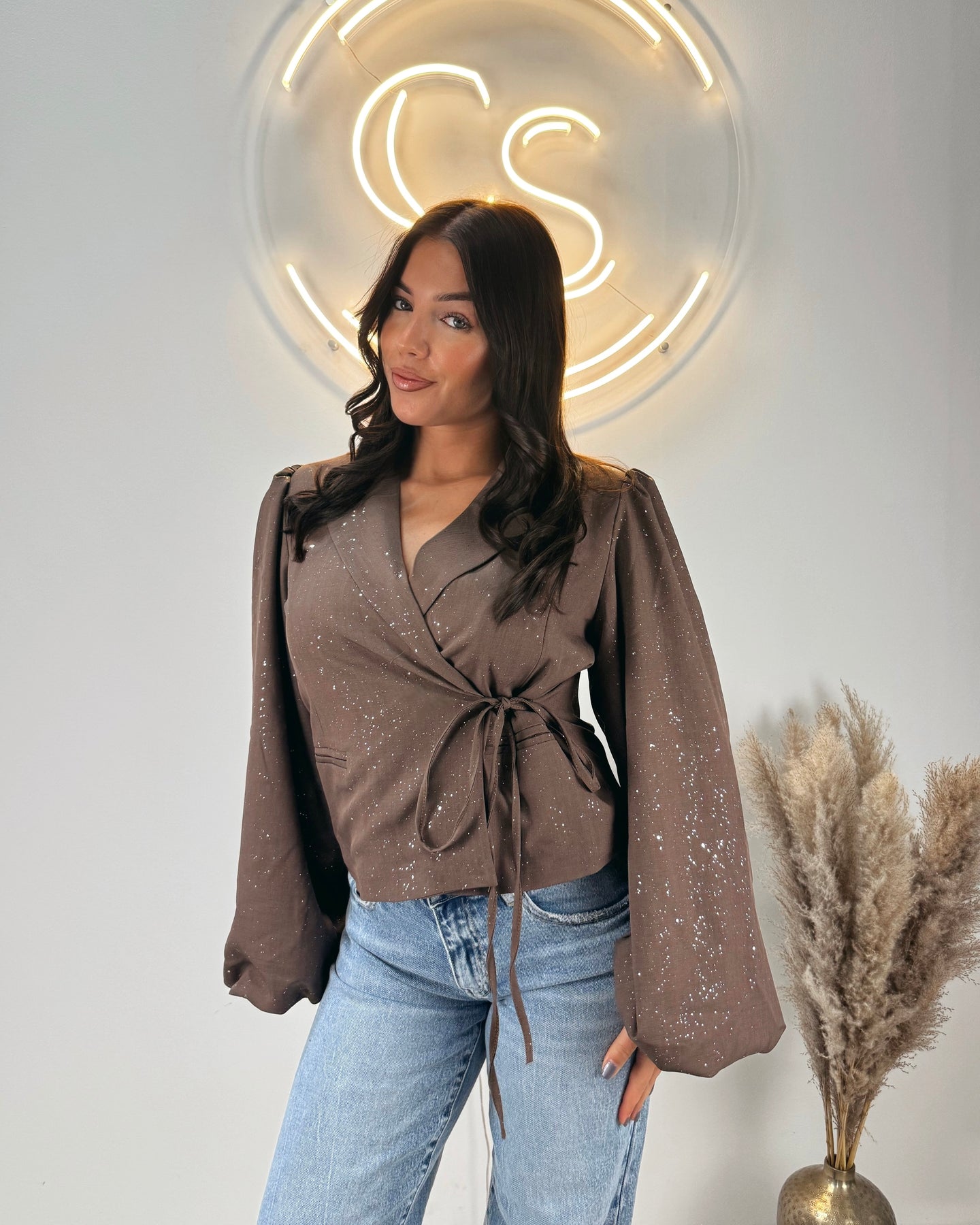 Regular price €44,95Onze Sparkle Wrap Blazer is een prachtige blazer met pof mouwtjes en glitters. De blazer strik je zelf vast met de touwtjes en is dus hierin verstelbaar. Deze blazer is perfect voor de feestdagen. How cute! Dit item is verkrijgbaar in het bruin en zwart.