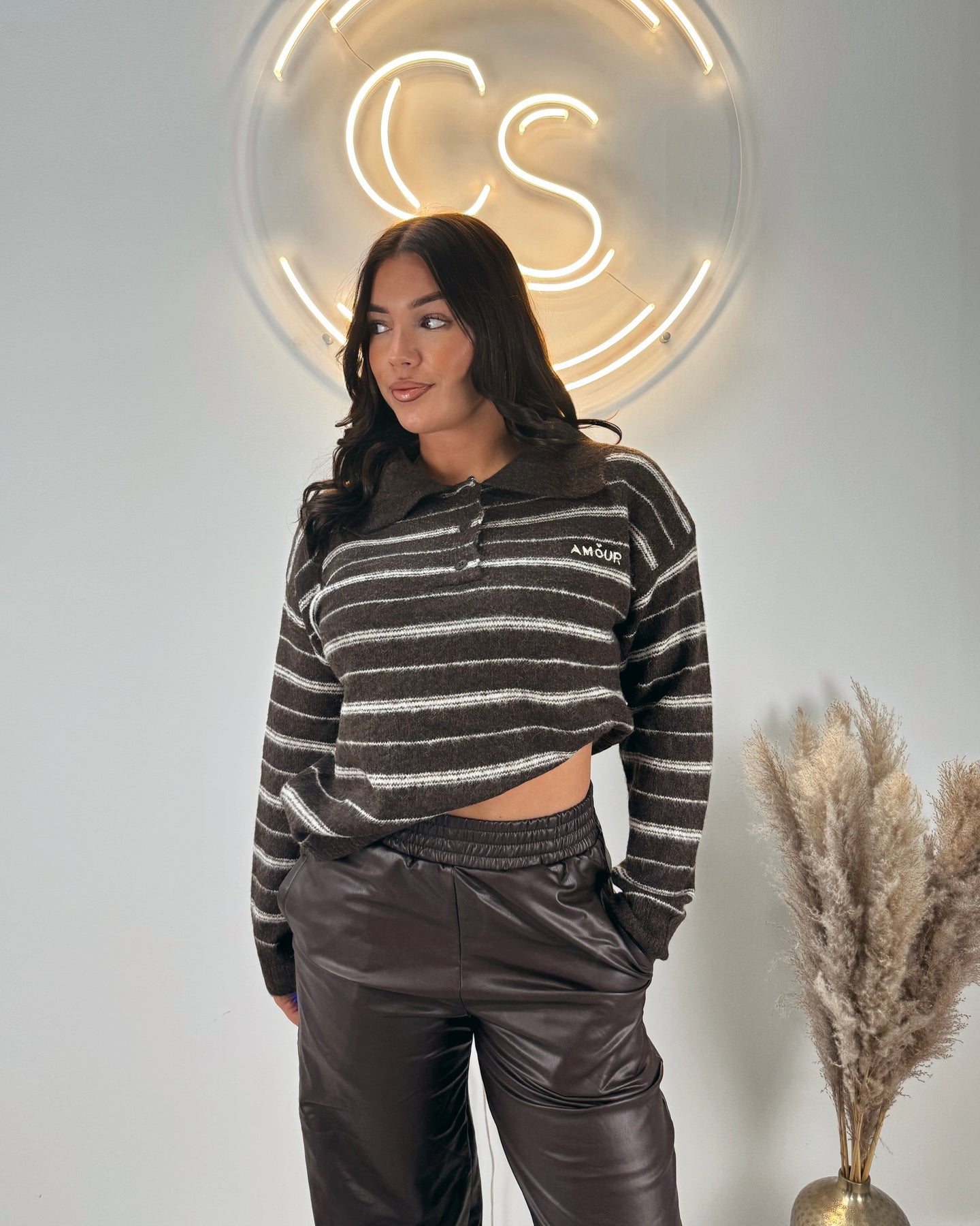 Regular price €44,95Onze Striped Knit Polo Sweater is een mega zacht truitje gemaakt van een knit stofje. De trui heeft trendy strepen en heeft de tekst ‘amour’ op de borst. Deze trui kriebelt niet! Dit item is verkrijgbaar in beige en bruin.