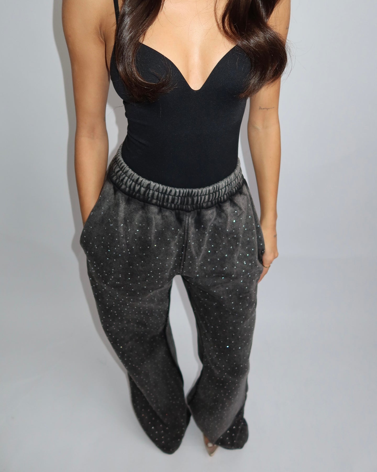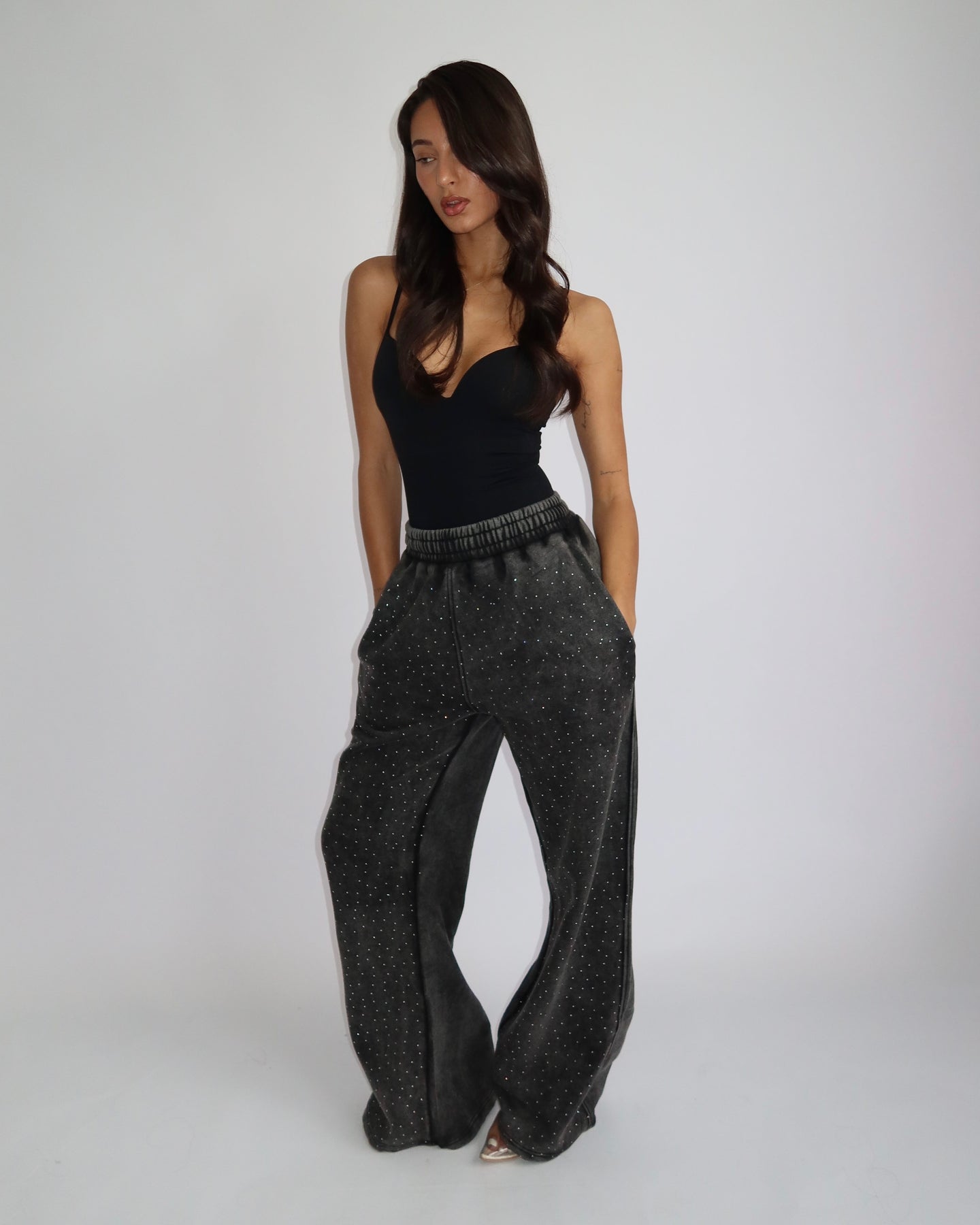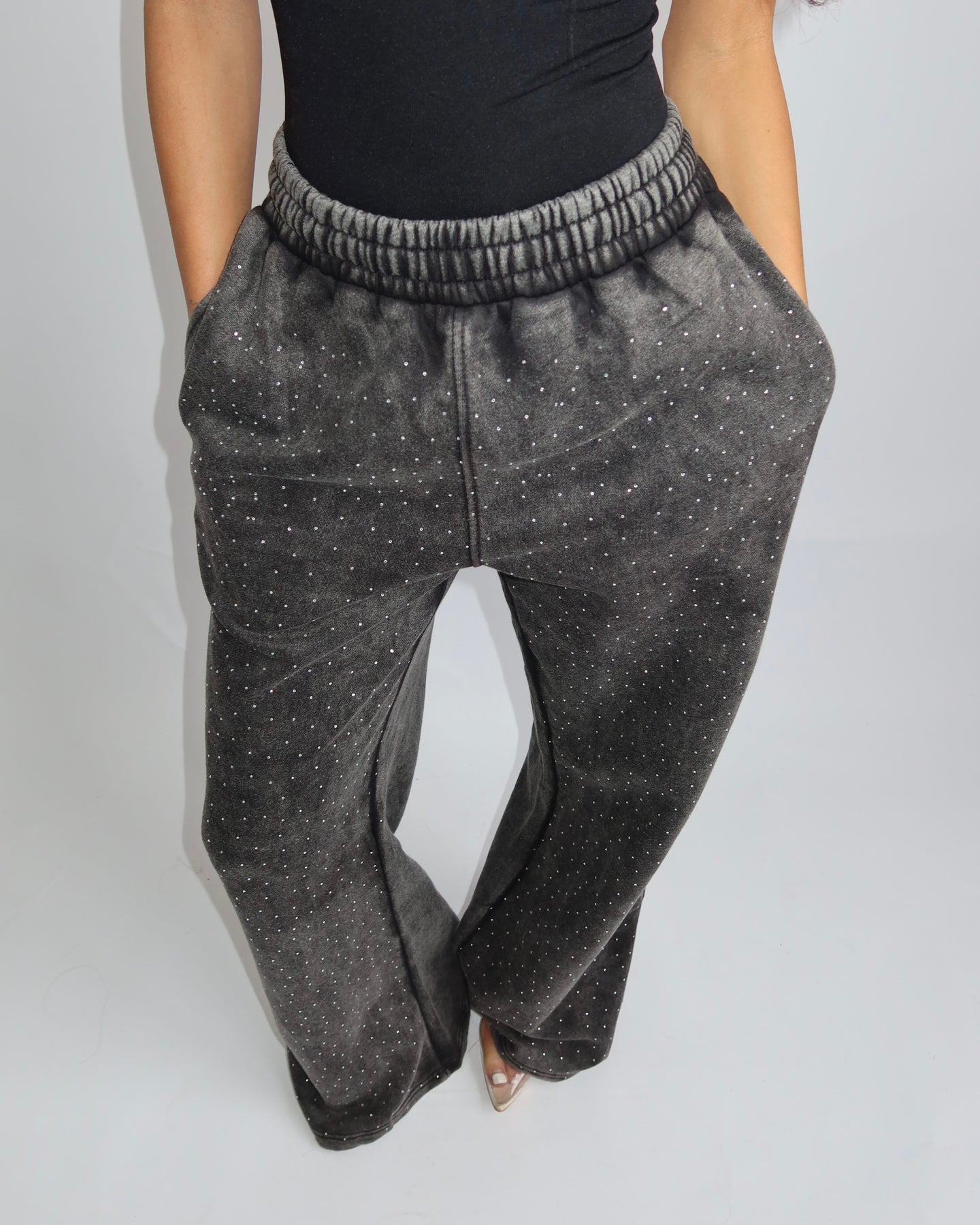 Onze Priority Rhinestone Jogging Pants is een oversized joggingbroek bedekt met rhinestone steentjes. De broek heeft een gewassen grijze kleur.