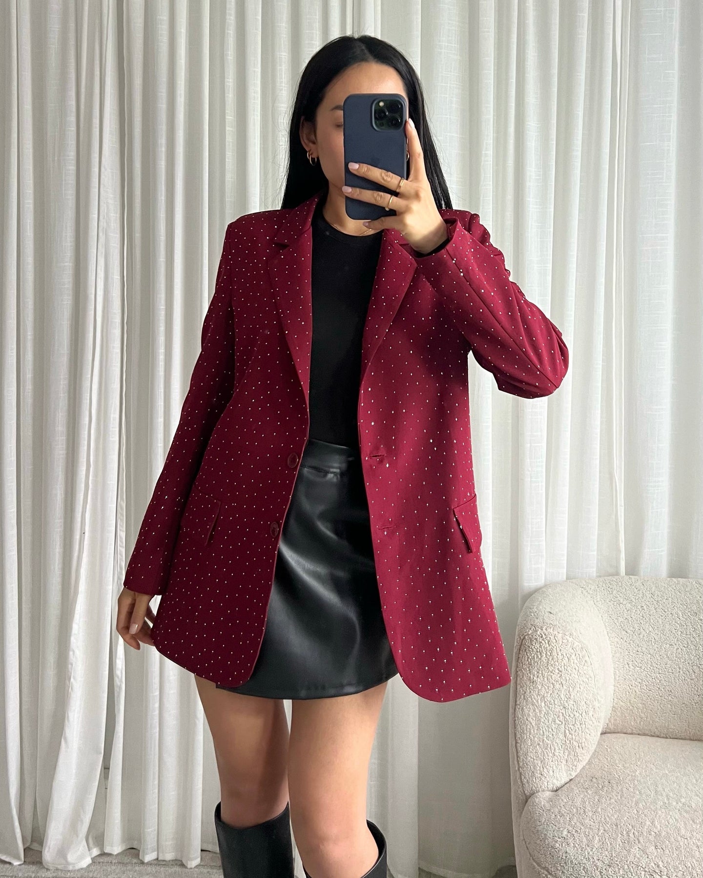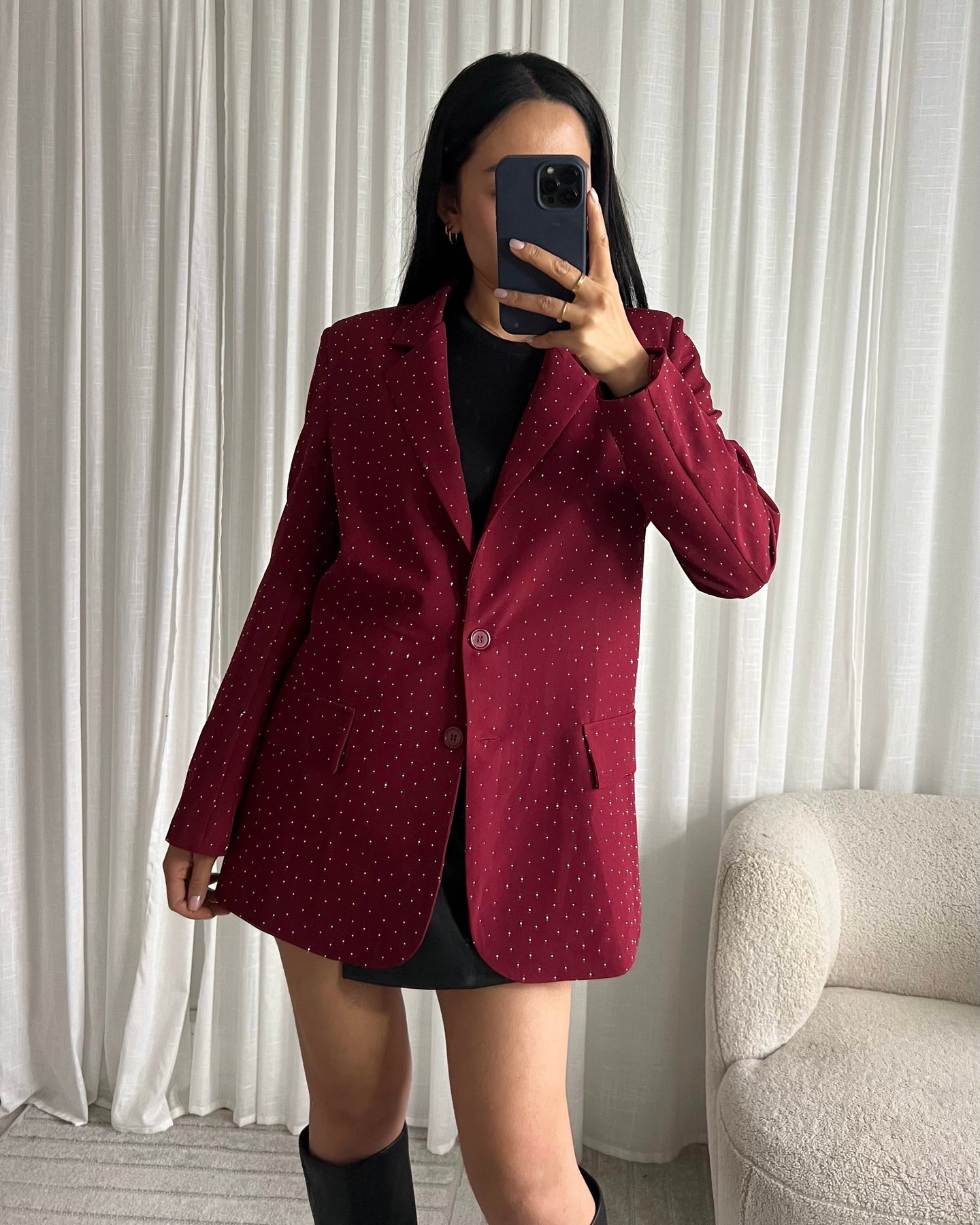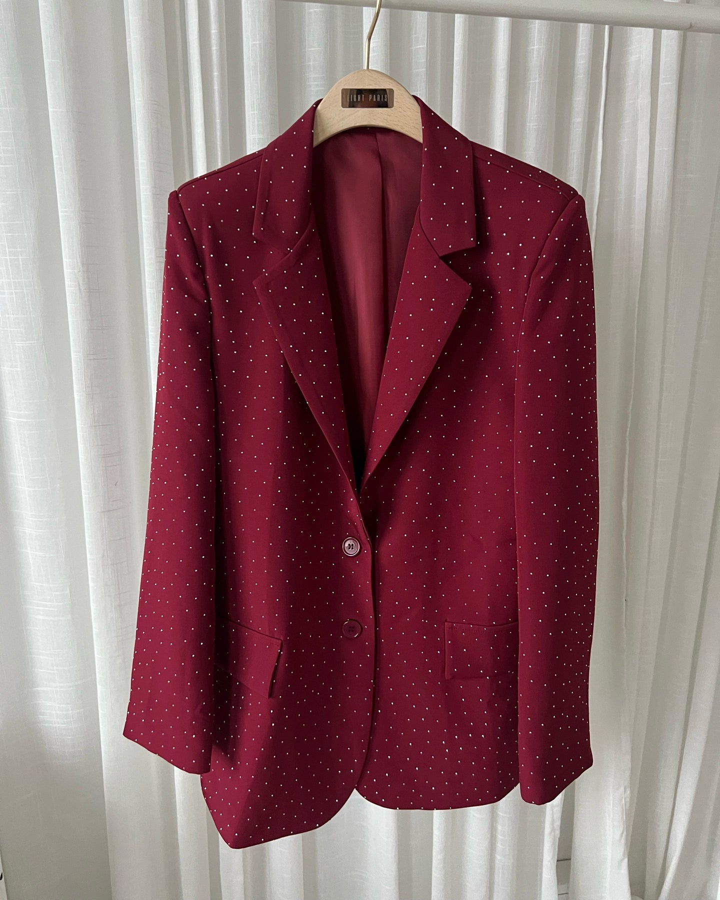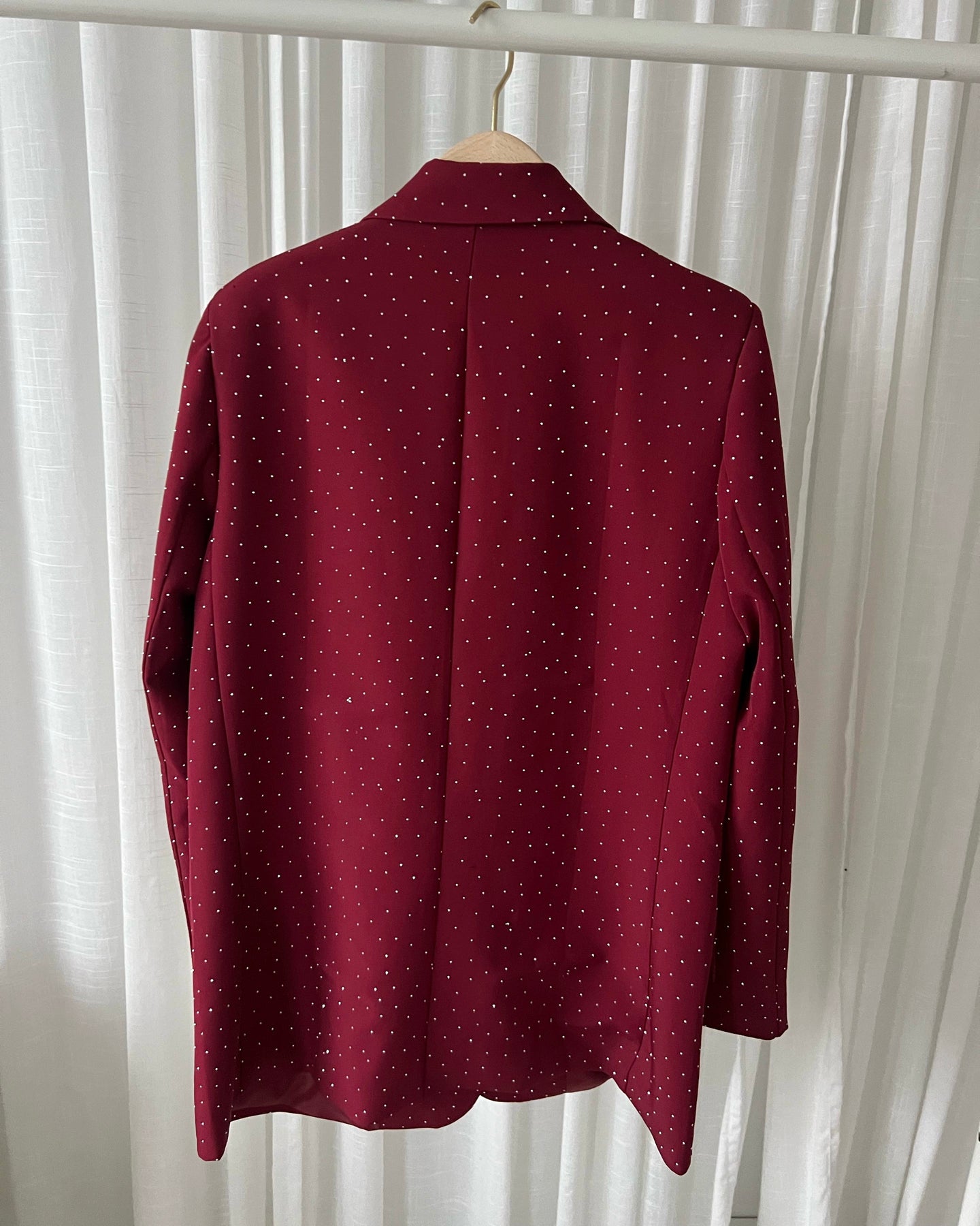 Onze Diamond Blazer is een blazer jasje met een oversized fit en prachtige glitter steentjes. De blazer heeft schoudervulling en heeft twee knopen om het jasje te sluiten. Combineer dit item met onze Straight Leg Trousers of Pleated Skort voor de perfecte look. Dit item is in verkrijgbaar in het bordeaux rood en zwart.