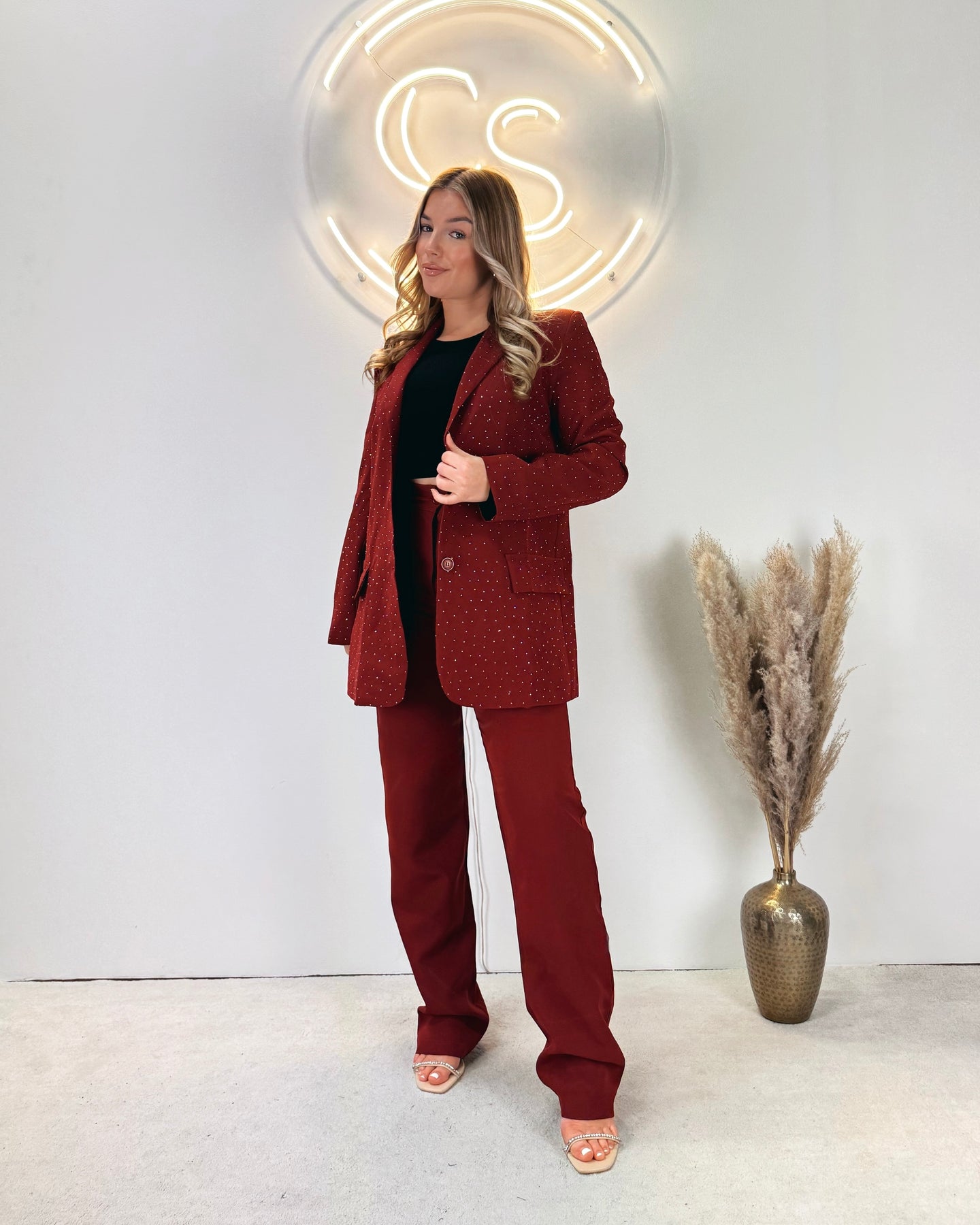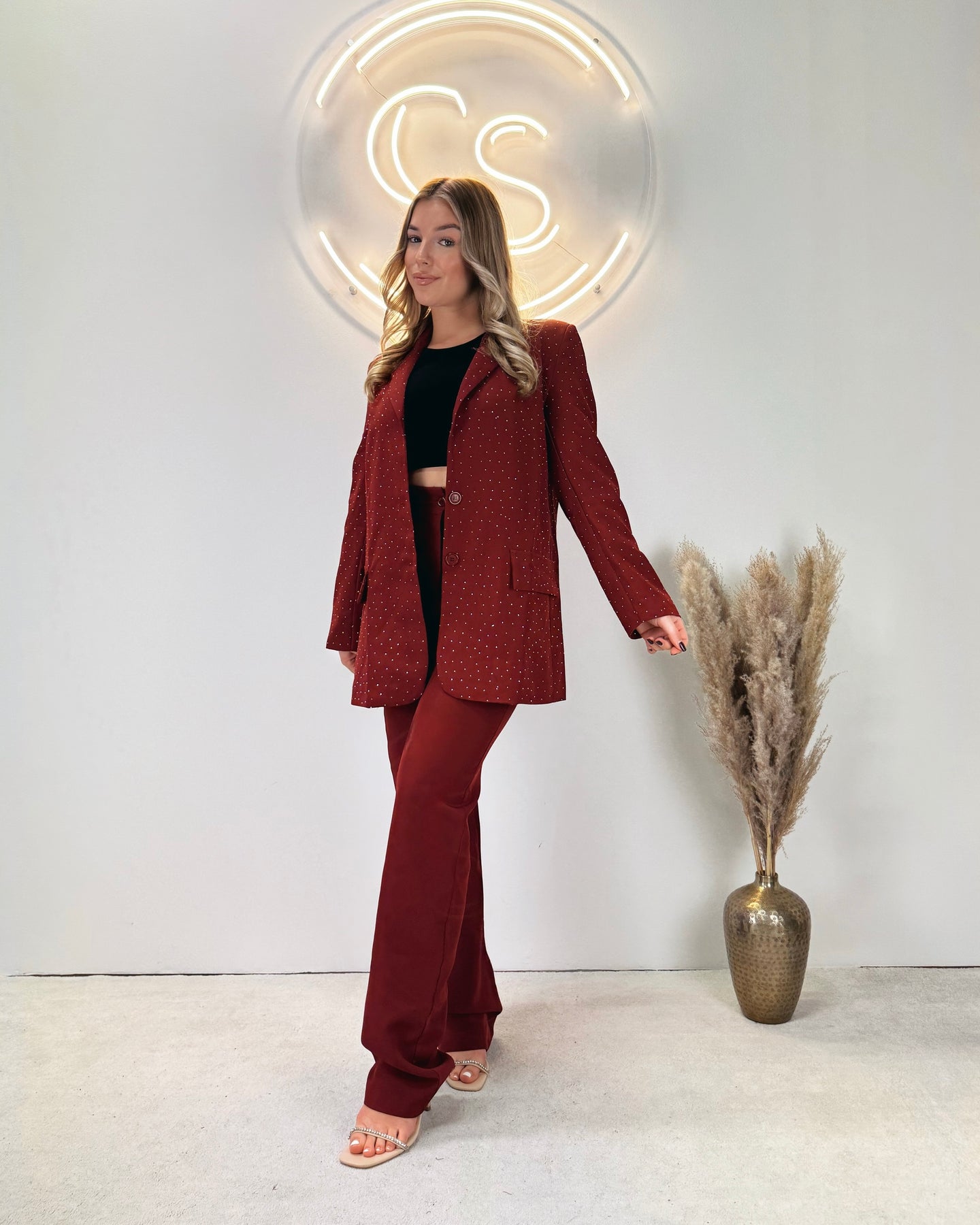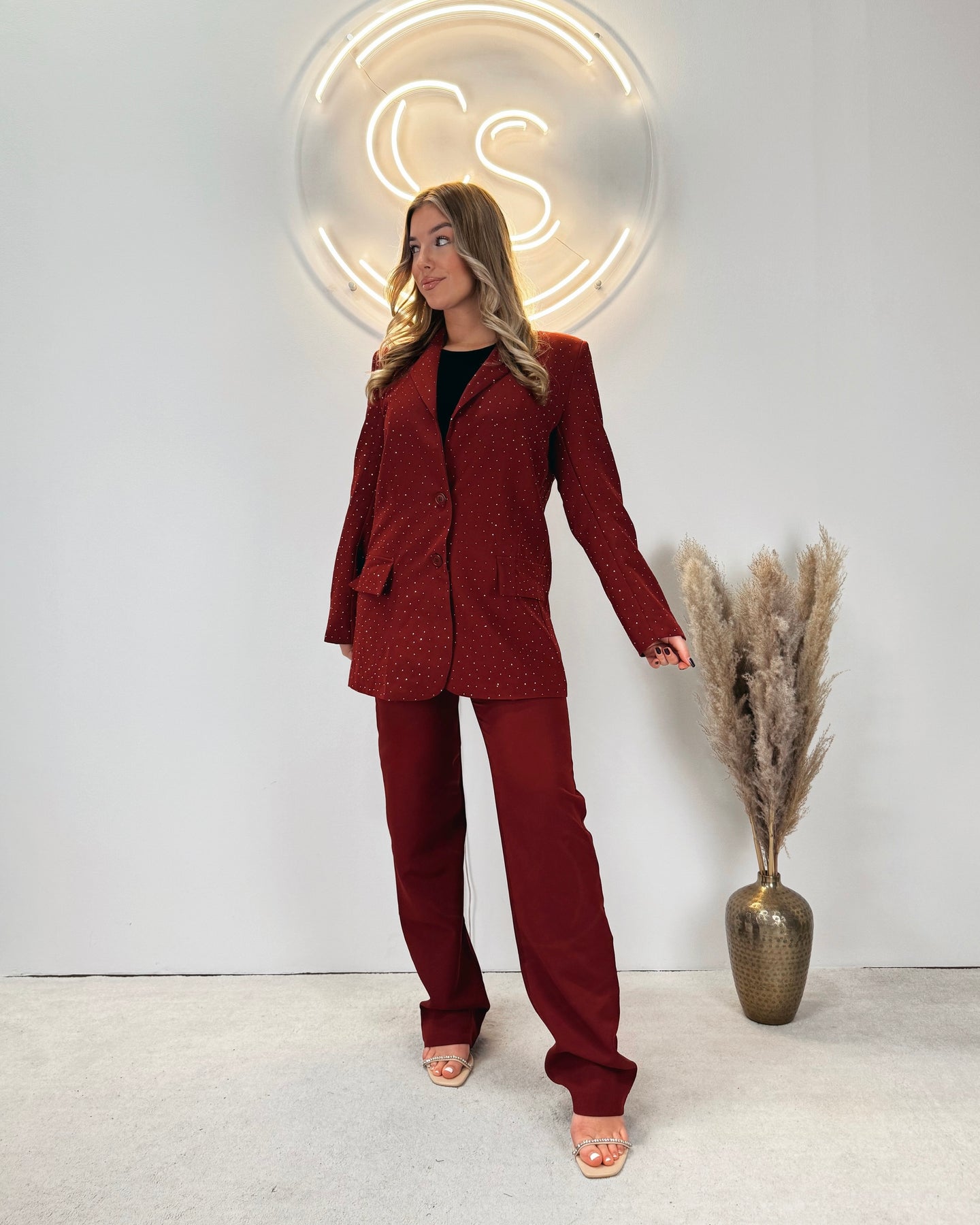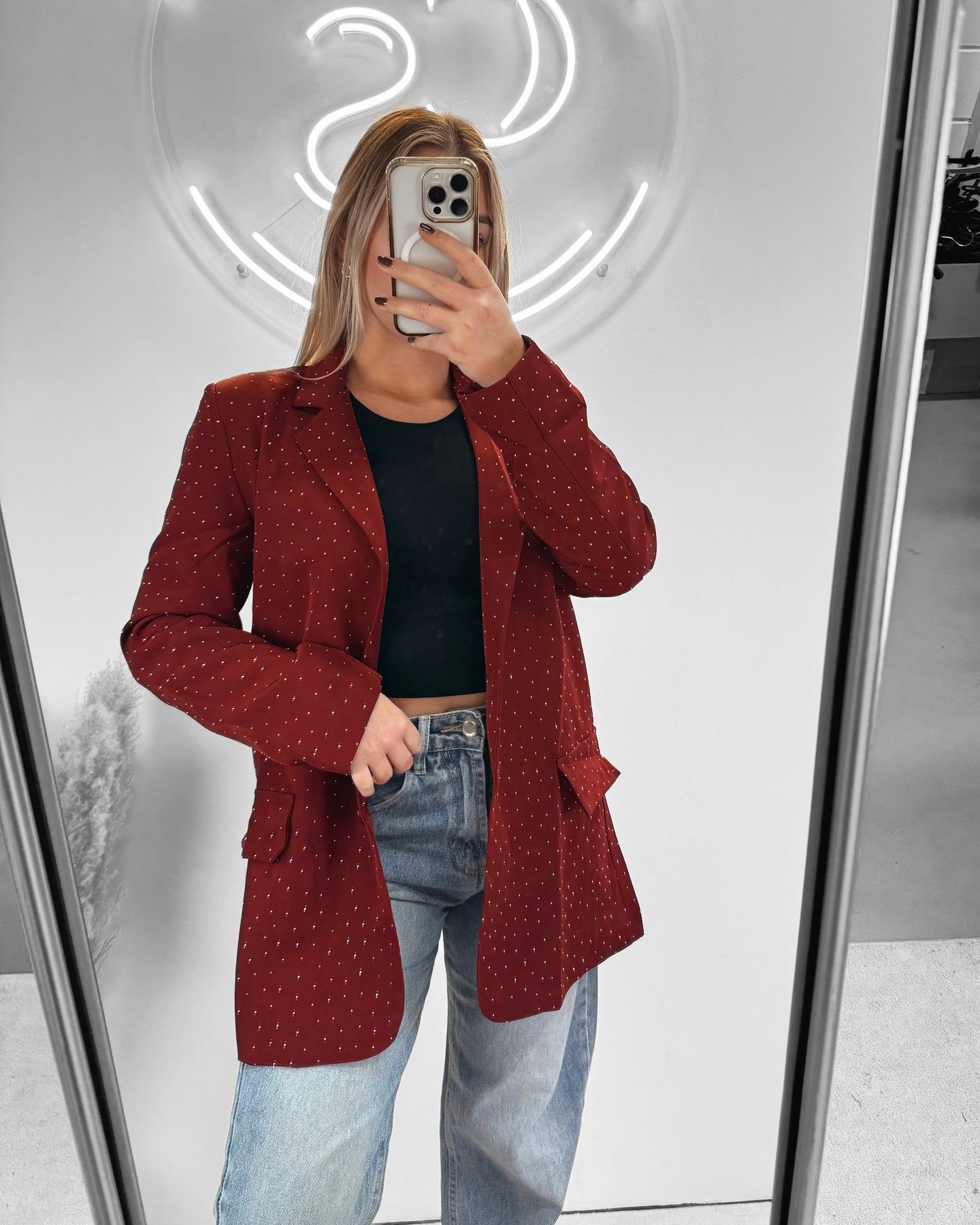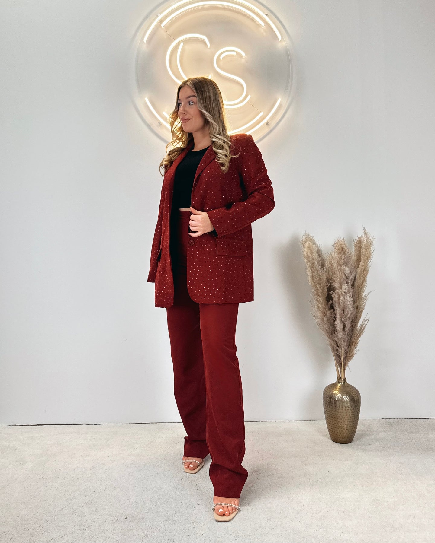 Onze Diamond Blazer is een blazer jasje met een oversized fit en prachtige glitter steentjes. De blazer heeft schoudervulling en heeft twee knopen om het jasje te sluiten. Combineer dit item met onze Straight Leg Trousers of Pleated Skort voor de perfecte look. Dit item is in verkrijgbaar in het bordeaux rood en zwart.