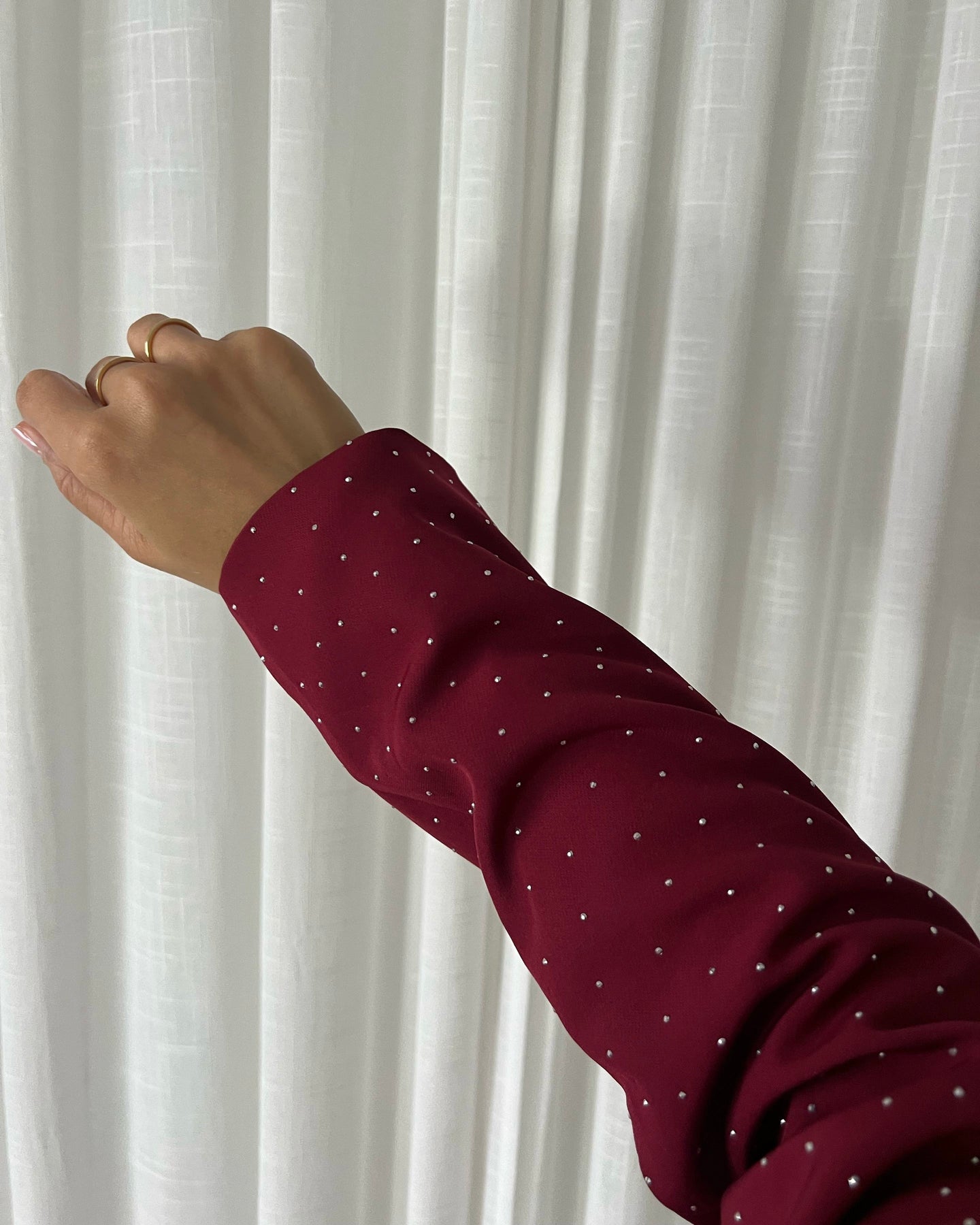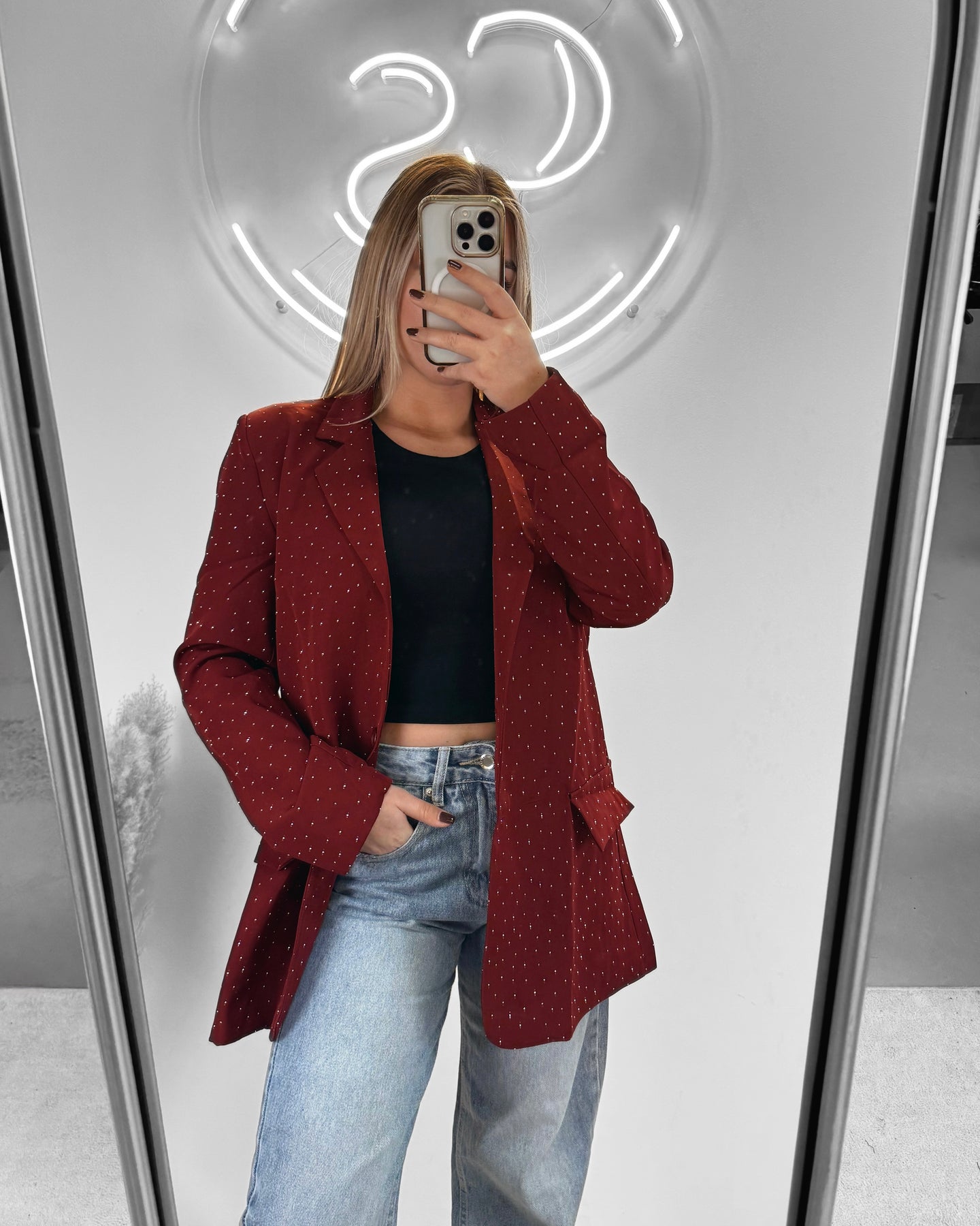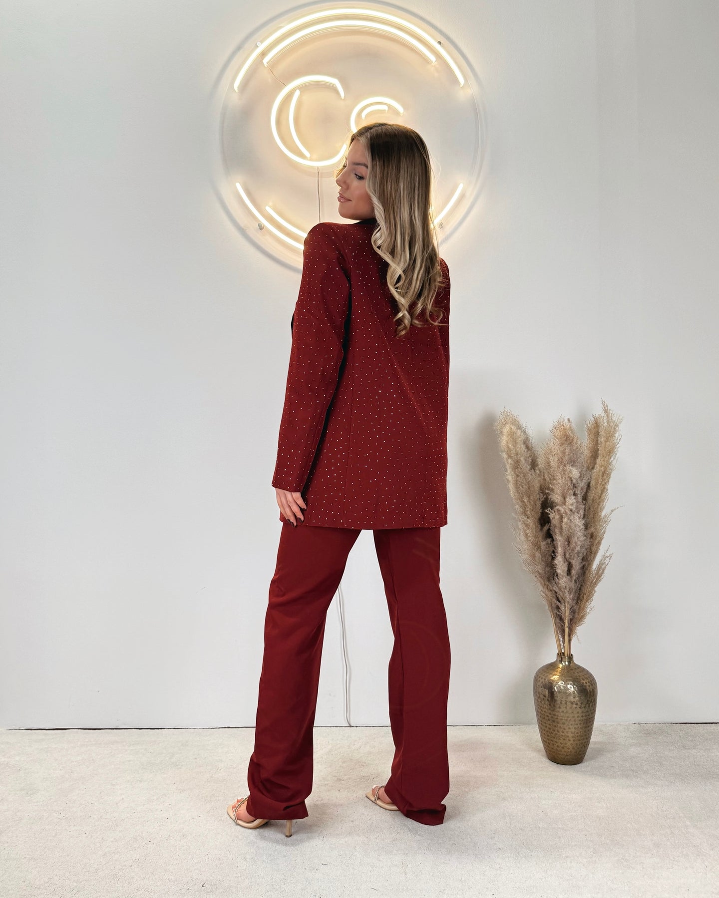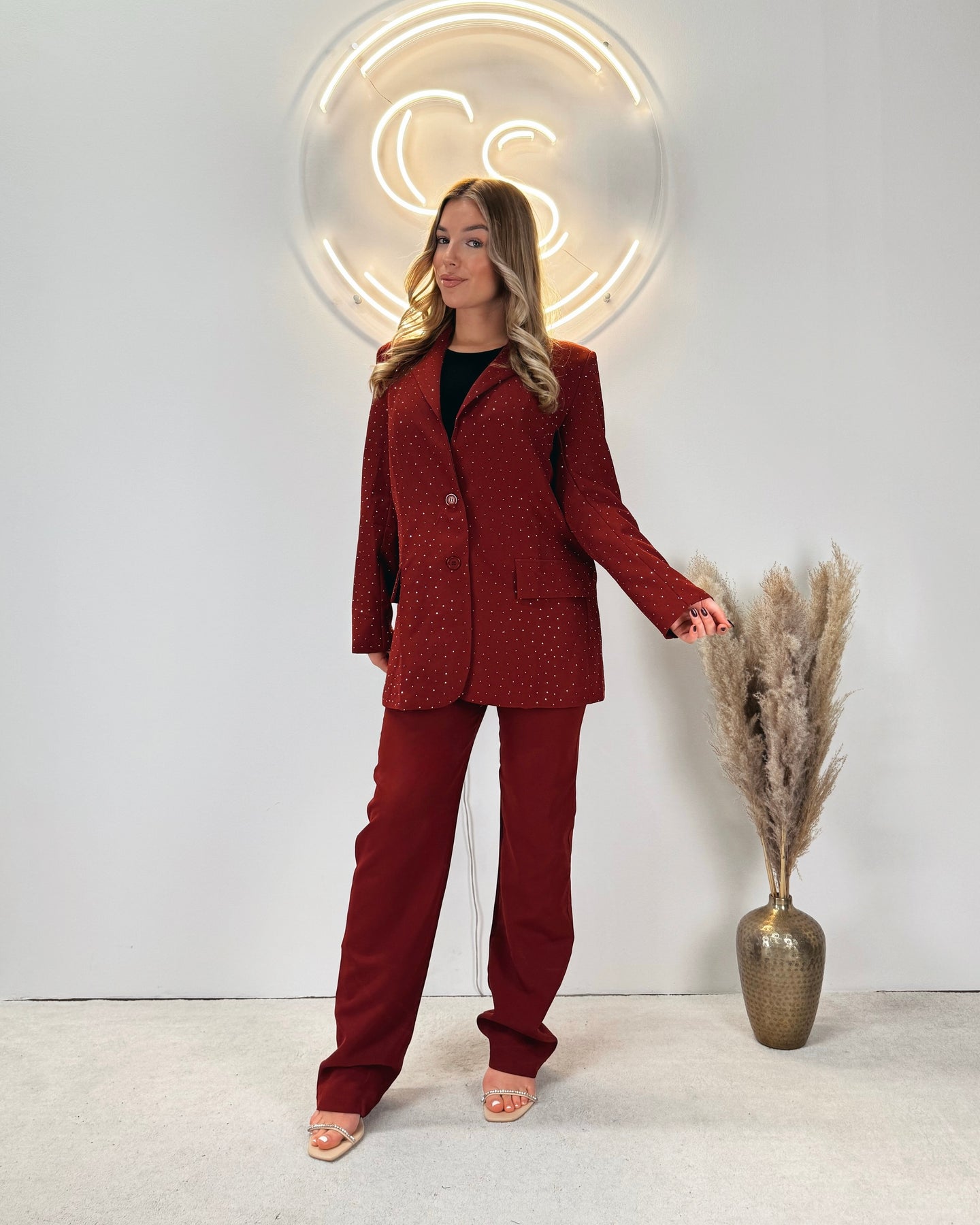 Onze Diamond Blazer is een blazer jasje met een oversized fit en prachtige glitter steentjes. De blazer heeft schoudervulling en heeft twee knopen om het jasje te sluiten. Combineer dit item met onze Straight Leg Trousers of Pleated Skort voor de perfecte look. Dit item is in verkrijgbaar in het bordeaux rood en zwart.