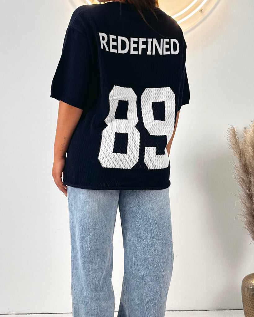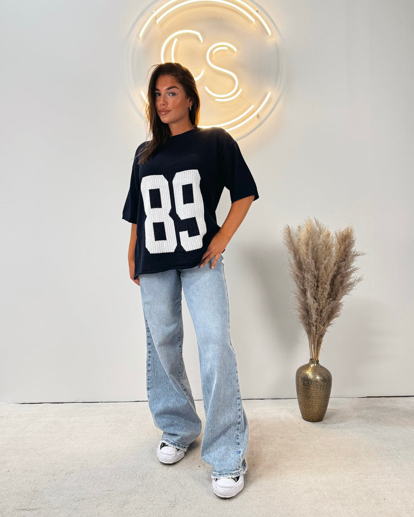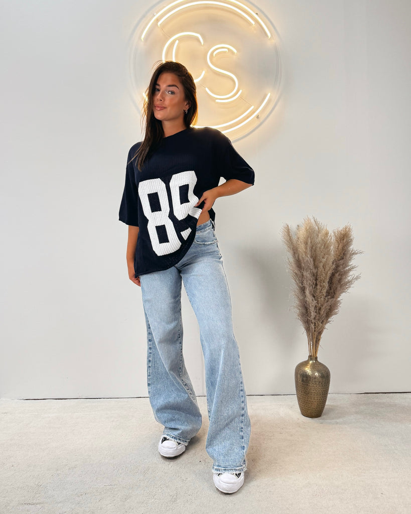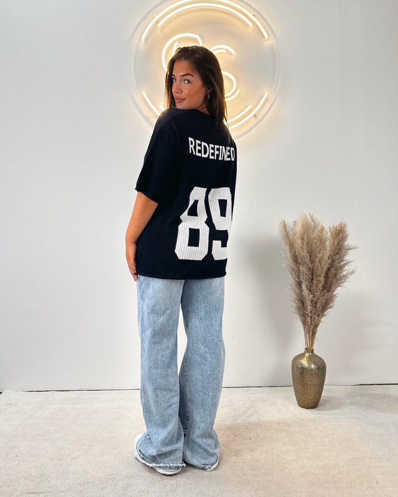 Onze Redefined Knit Jersey T-shirt Navy Blue is een comfy maar stylish item! Deze jersey is gemaakt van een knitted stof en heeft trendy details op de voor- en achterkant. De jersey zit heerlijk comfy & valt oversized.
