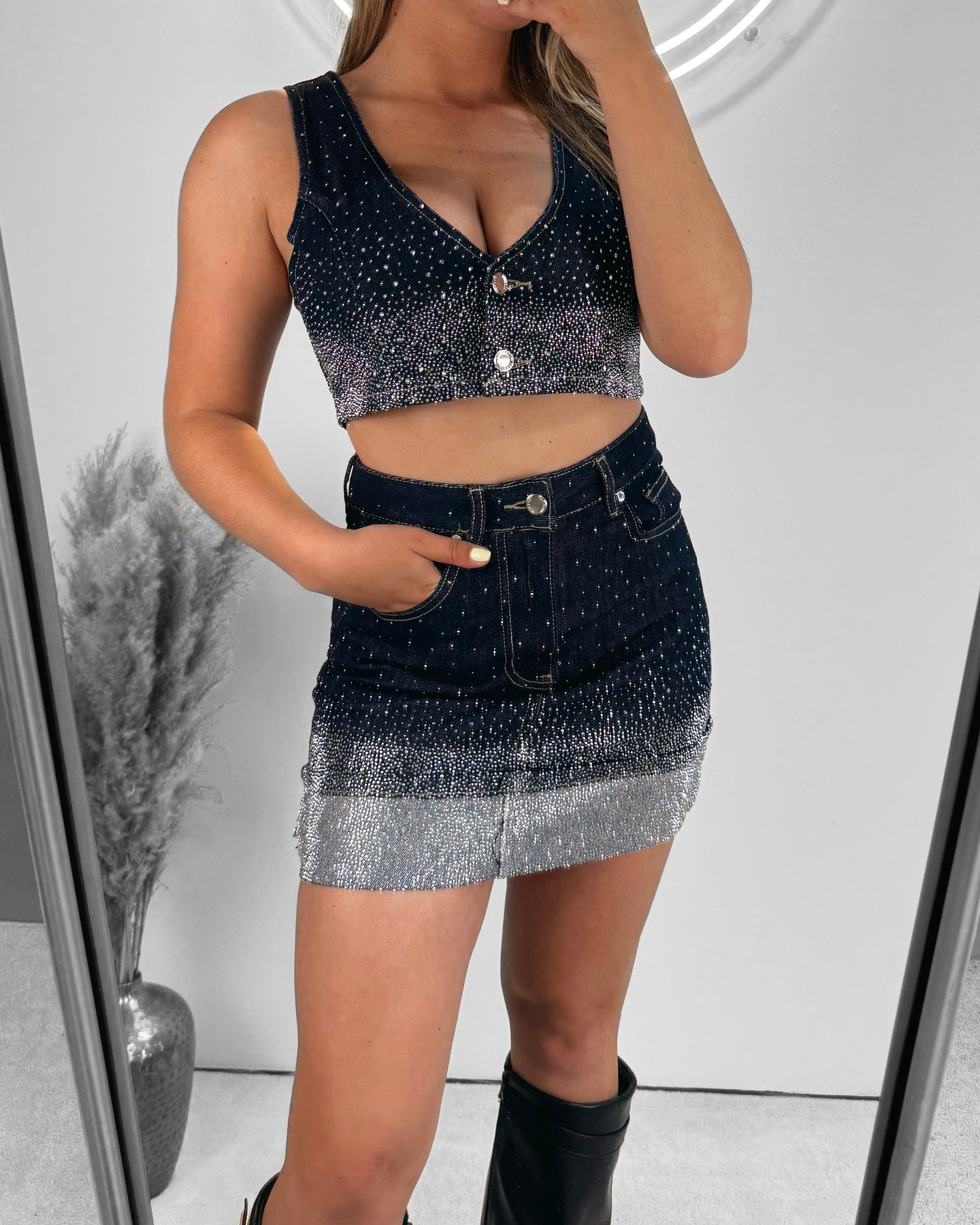 Onze Sparkle Denim Rok Donkerblauw is een mega leuk rokje in een donkerblauwe kleur. De rok heeft veel glittersteentjes en een omslagrand. Combineer dit item met onze Sparkle Denim Top Dark Blue voor de perfecte matchende set!