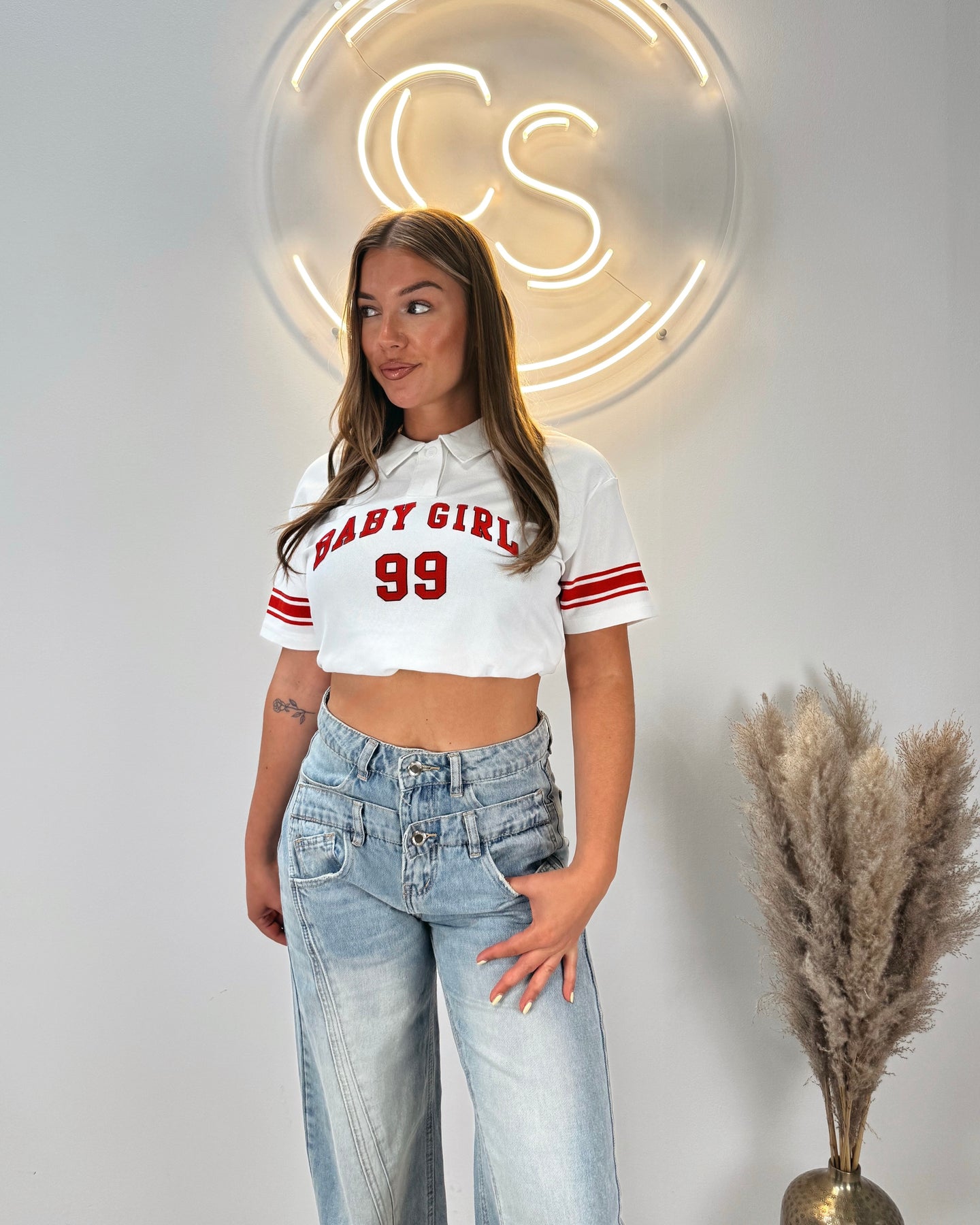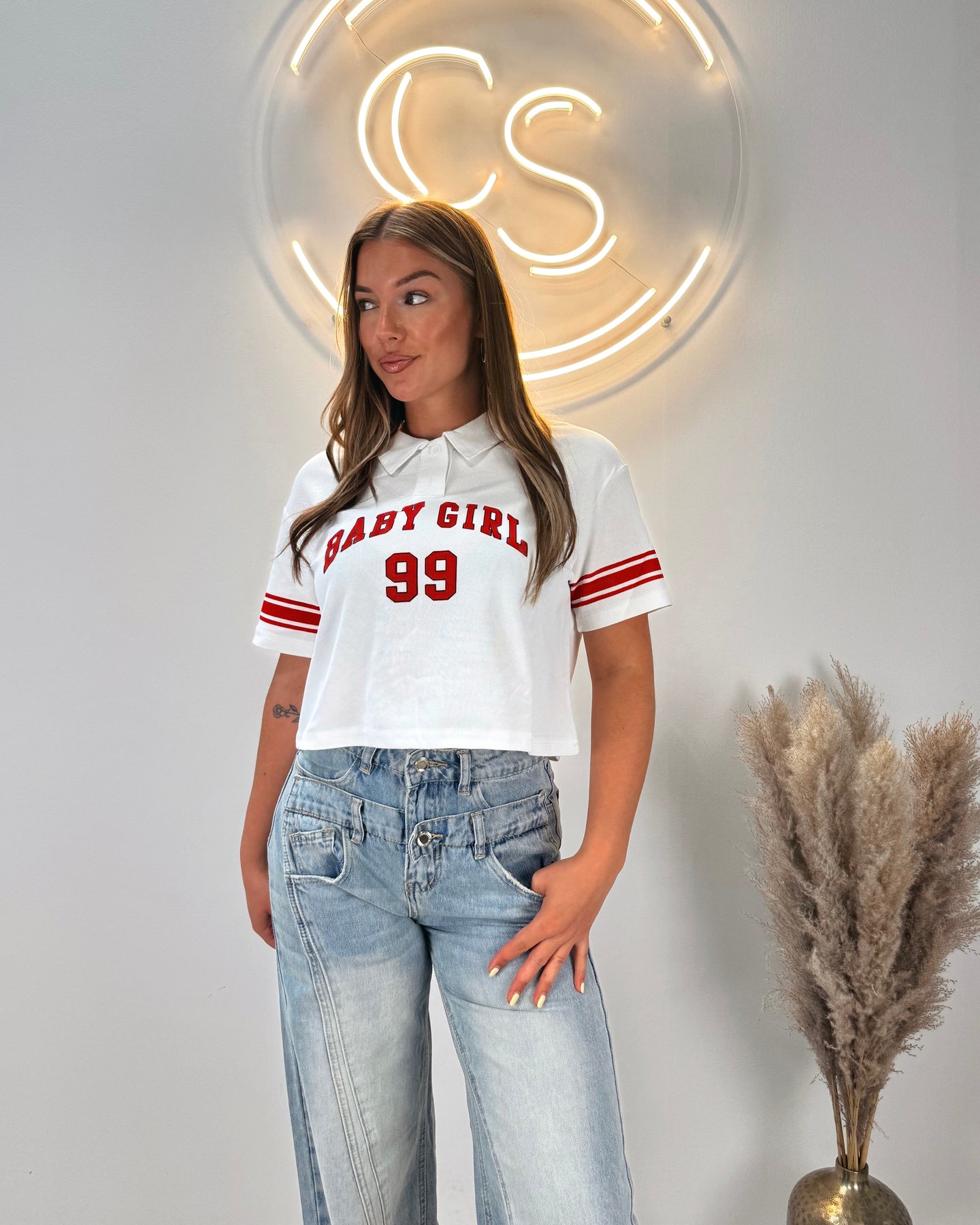 Normale prijs €29,95 Verkoopprijs €9,95 Bespaar 67%Onze Baby Girl Polo Top is een schattig polotopje met een kraagje. De top valt ietsjes korter en is mega leuk om op een jeans te dragen! De top bevat de tekst 'baby girl'. Deze top is verkrijgbaar in navy blauw & wit.